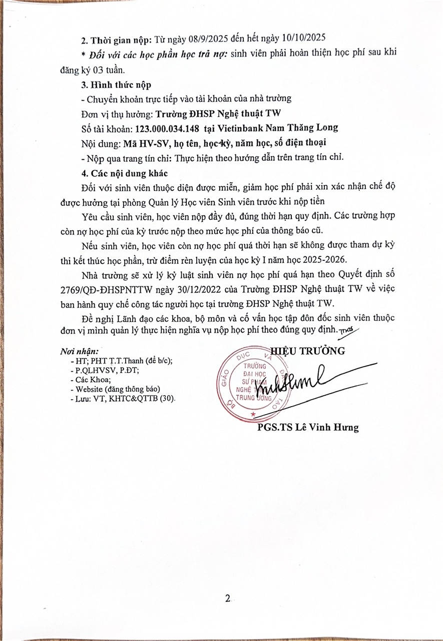 Thông báo 1671/TB-ĐHSPNTTW, Thông báo V/v thu học phí học kỳ I năm học 2025-2026