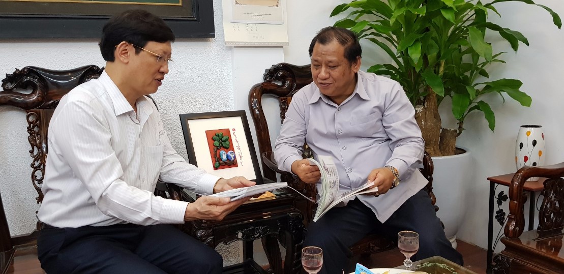 TS. Outhay Bannavong Outhay Bannavong – Bí thư thứ nhất của Đại sứ quán nước CHDCND Lào tại Việt Nam (bên trái) làm việc tại NUAE