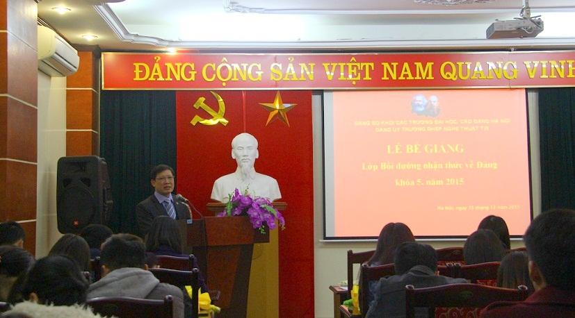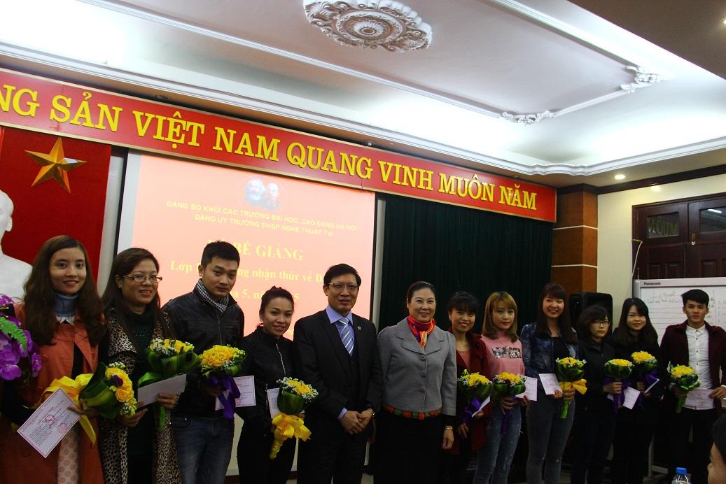 Chiều ngày 15/12/2015, Đảng ủy Trường ĐHSP Nghệ thuật TW đã tổ chức lễ bế giảng “Lớp Bồi dưỡng nhận thức về Đảng khóa 5, năm 2015”. Tới dự buổi lễ có TS. Đào Đăng Phượng – Phó bí thư Đảng ủy, Phó hiệu trưởng; PGS.TS. Trịnh Hoài Thu – Ủy viên Ban thường vụ Đảng ủy, Chủ nhiệm Ủy ban kiểm tra Đảng, Phó hiệu trưởng Nhà trường cùng các đồng chí trong Ban chấp hành Đảng ủy, đại diện các Chi bộ trong toàn Đảng bộ và 123 học viên Lớp Bồi dưỡng nhận thức về Đảng khóa 5.