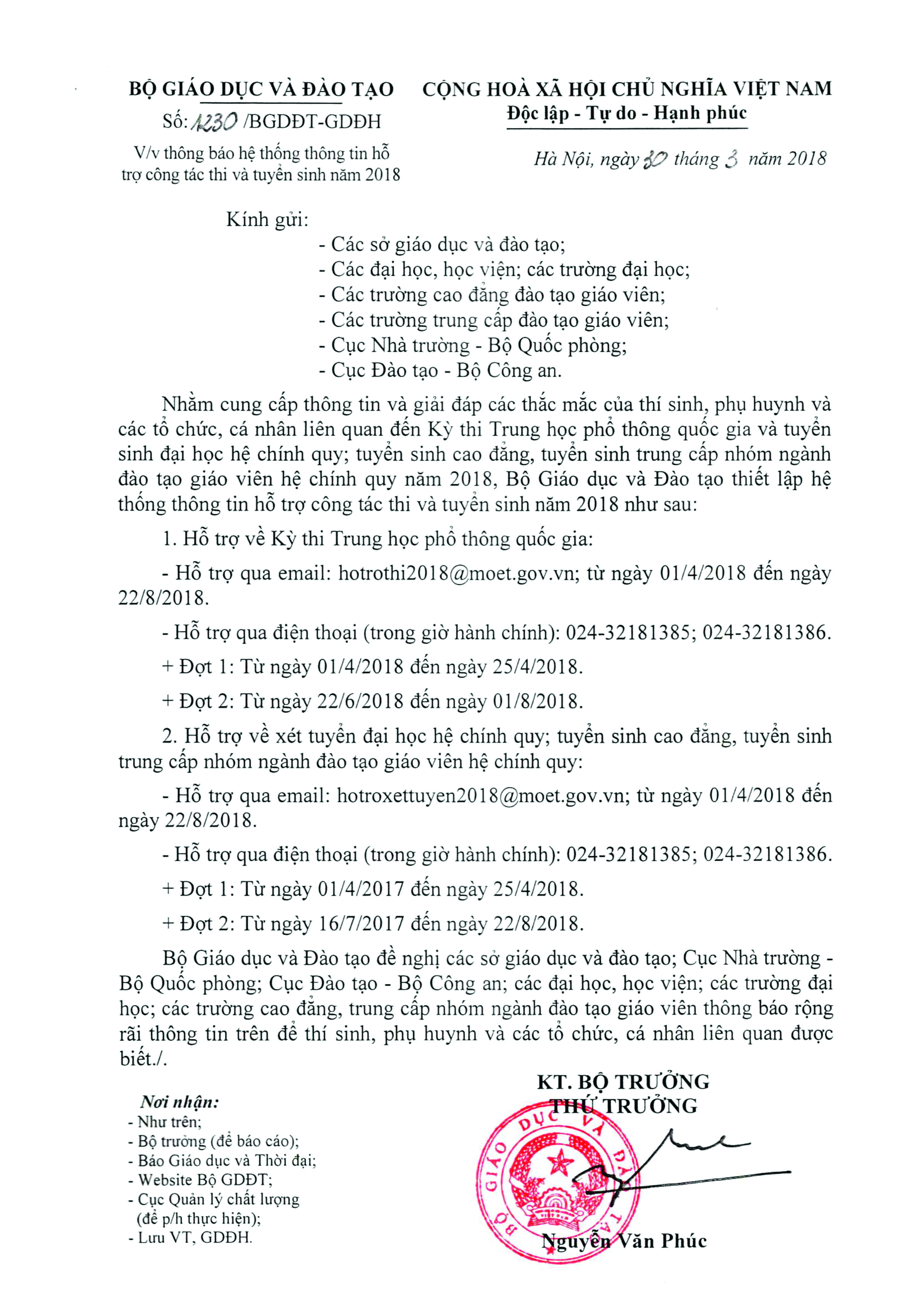 Ngày 30/3/2018, Bộ Giáo dục và Đào tạo đã có công văn gửi các sở giáo dục và đào tạo; các đại học, học viện; các trường đại học; các trường cao đẳng đào tạo giáo viên; các trường trung cấp đào tạo giáo viên; cục Nhà trường, Bộ Quốc phòng và cục Đào tạo, Bộ Công an thông báo về hệ thống thông tin hỗ trợ công tác thi và tuyển sinh năm 2018.