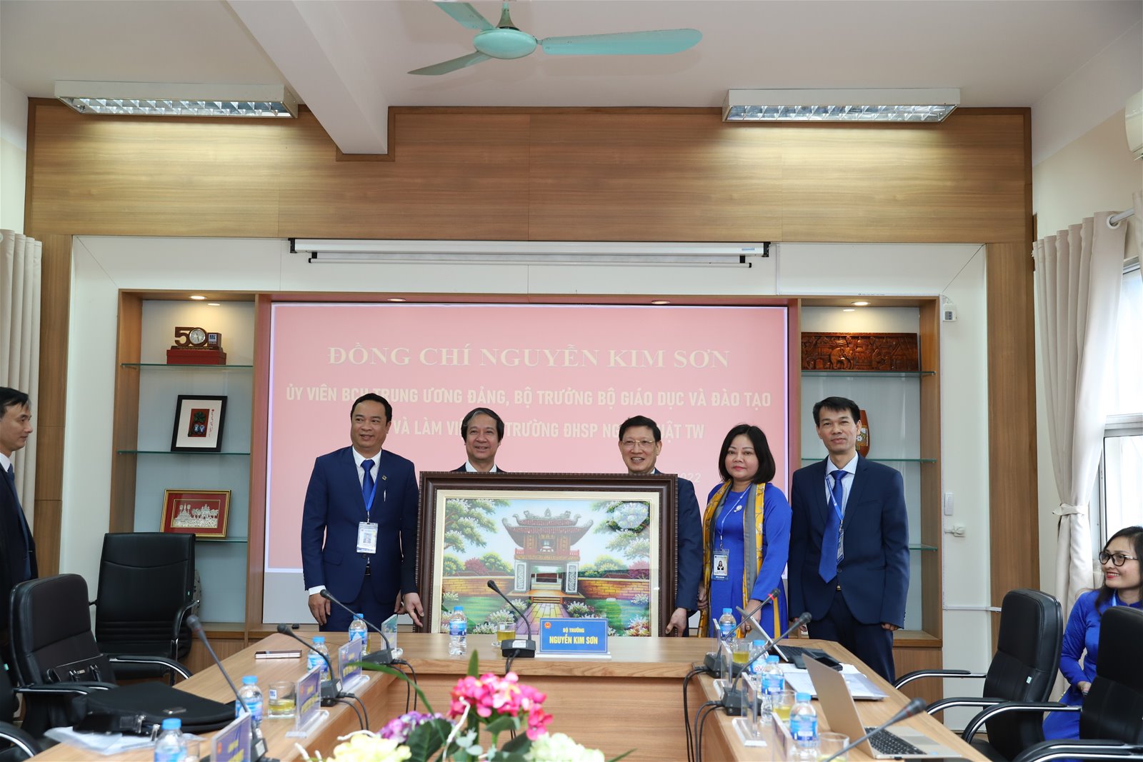 Thay mặt Đoàn công tác, Bộ trường Nguyễn Kim Sơn chúc mừng những kết quả tốt đẹp của Trường ĐHSP Nghệ thuật TW trong quá trình xây dựng và phát triển vừa qua, Trường đã đào tạo ra nhiều thế hệ giáo viên nghệ thuật cho đất nước. Bộ trưởng cũng ghi nhận những đóng góp tích cực của Trường với hoạt động chung của Bộ trong các sự kiên, các hoạt động văn hoá văn nghệ như: Hội nghị Bộ trưởng Asean, Cuộc gặp mặt giữa Bộ trưởng và các nhà giáo tiêu biểu nhân dịp kỷ niệm 40 năm ngày Nhà giáo Việt Nam… Trong thời gian tới, phát huy truyền thống và những thành tích đã đạt được, Nhà trường cần xác định rõ trọng tâm, sở trường, thế mạnh để tập trung đầu tư. Bộ trưởng gợi mở Nhà trường mở thêm khoa lý luận phê bình chuyên sâu, mở trường phổ thông năng khiếu nhằm phát hiện, định hướng phát triển tài năng, nâng cao chất lượng đội ngũ giảng viên…Bộ trưởng nhấn mạnh: Đối với hệ thống giáo dục đại học, đổi mới sáng tạo trường nào cũng cần, nhưng đối với một trường nghệ thuật, tính đổi mới sáng tạo, càng cần thiết hơn. Bộ trưởng cũng mong muốn rằng, Trường ĐHSP Nghệ thuật TW sẽ xác định được con đường đi phù hợp nhất, phát huy được lợi thế của mình, đi bằng đúng sở trường để đi xa nhất và thành công nhất. Bằng tất cả sự quan tâm của lãnh đạo Bộ GD&ĐT đối với Trường ĐHSP Nghệ thuật TW, Bộ trưởng Nguyễn Kim Sơn khẳng định sẽ tiếp tục có những buổi làm việc về định hướng phát triển của Nhà trường trong thời gian tới.