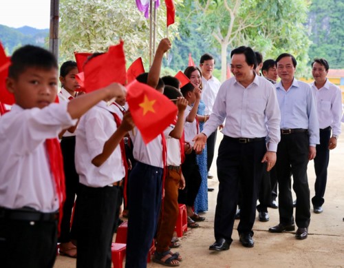 Bộ trưởng Phùng Xuân Nhạ dự khai giảng muộn cùng thầy trò vùng lũ Quảng Bình