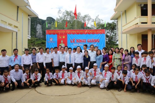 Trong buổi Lễ Khai giảng muộn, Bộ trưởng Bộ Giáo dục và Đào tạo Phùng Xuân Nhạ cùng lãnh đạo tỉnh Quảng Bình đã tới dự và động viên tinh thần vượt khó của thầy và trò các trường mầm non, Tiểu học, THCS trên địa bàn xã Tân Hoá.