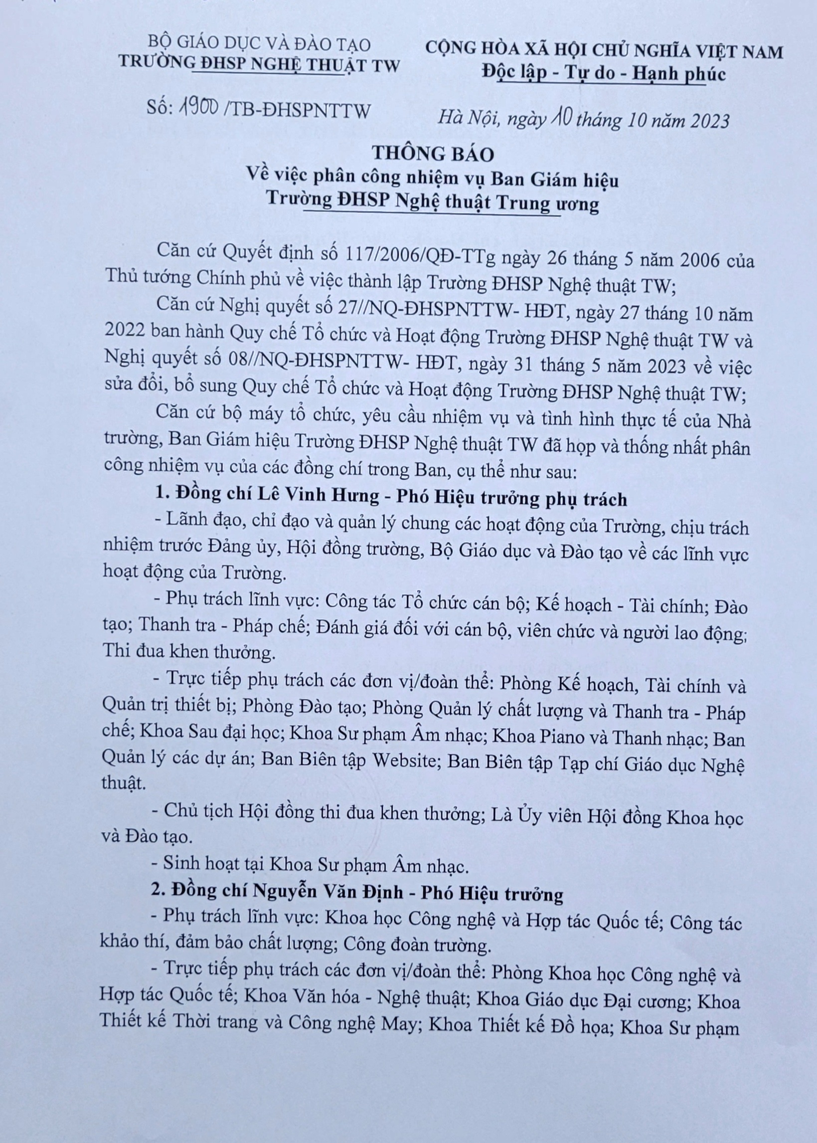 Thông báo số 1900/TB – ĐHSPNTTW, ngày 10/10/2023 v/v Phân công nhiệm vụ Ban Giám hiệu trường ĐHSP Nghệ thuật TW