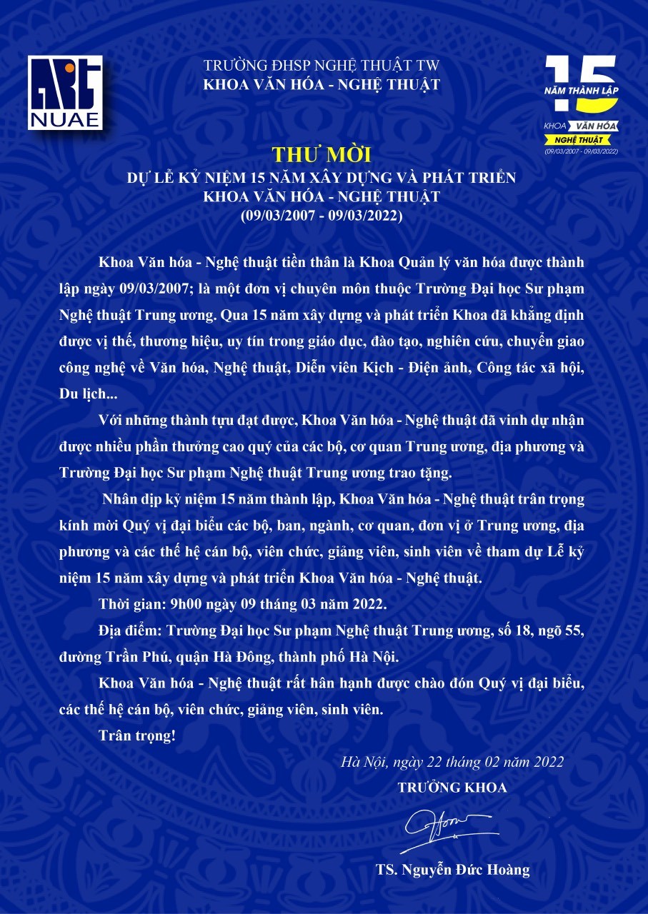 Thư mời dự Lễ kỷ niệm 15 năm xây dựng và phát triển Khoa Văn hóa – Nghệ thuật