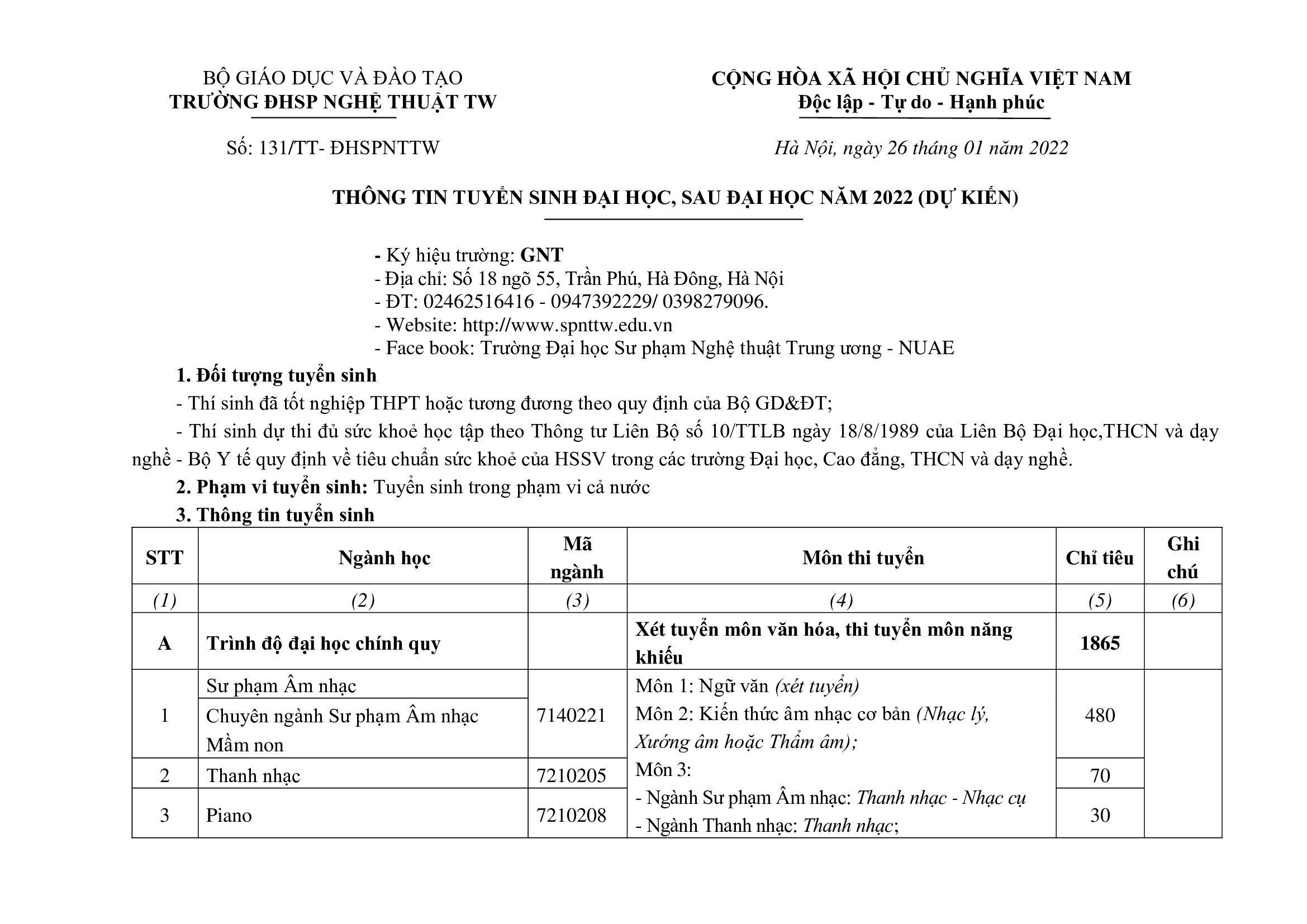 Thông báo số 131/TT-ĐHSPNTT, ngày 26/1/2022 V/v Thông tin Tuyển sinh Đại học, Sau Đại học năm 2022 (dự kiến) của trường ĐHSP Nghệ thuật TW