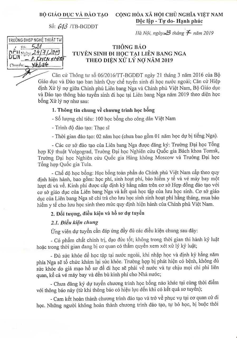 THÔNG BÁO tuyển sinh đi học tại Liên Bang Nga theo diện xử lý nợ năm 2019