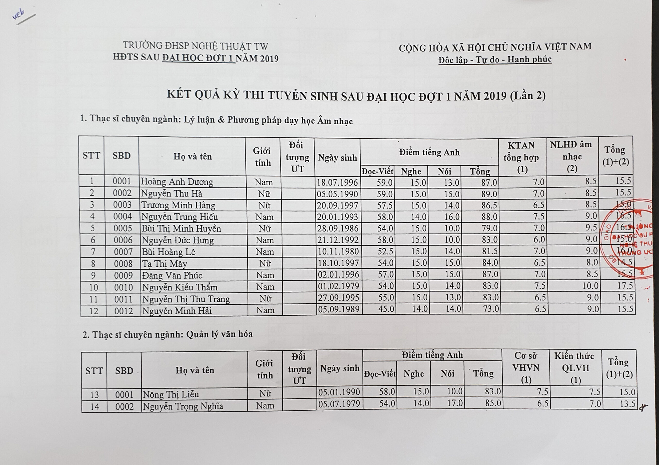QUYẾT ĐỊNH Công nhận kết quả trúng tuyển đại học hệ chính quy bổ sung đợt 2 năm 2019 tại trường ĐHSP Nghệ thuật TW