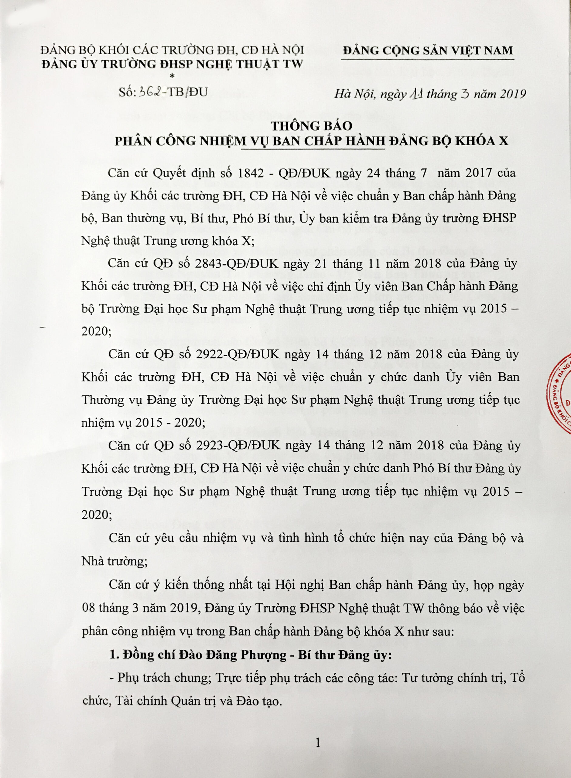THÔNG BÁO PHÂN CÔNG NHIỆM VỤ BAN CHẤP HÀNH ĐẢNG BỘ KHÓA X