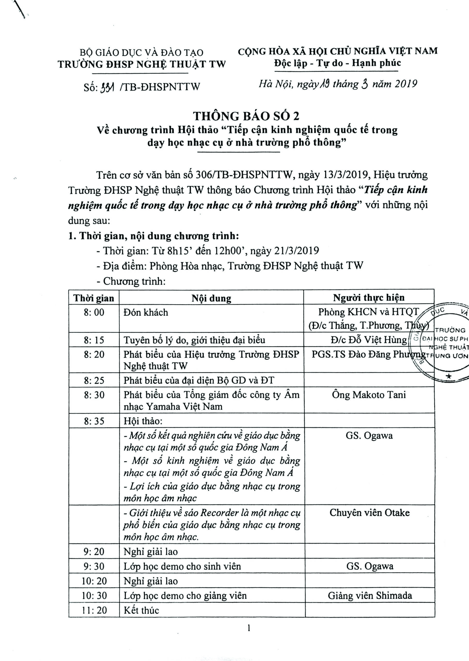 THÔNG BÁO SỐ 1 V/v Tổ chức Hội thảo “Tiếp cận kinh nghiệm quốc tế trong dạy học nhạc cụ ở nhà trường phổ thông”