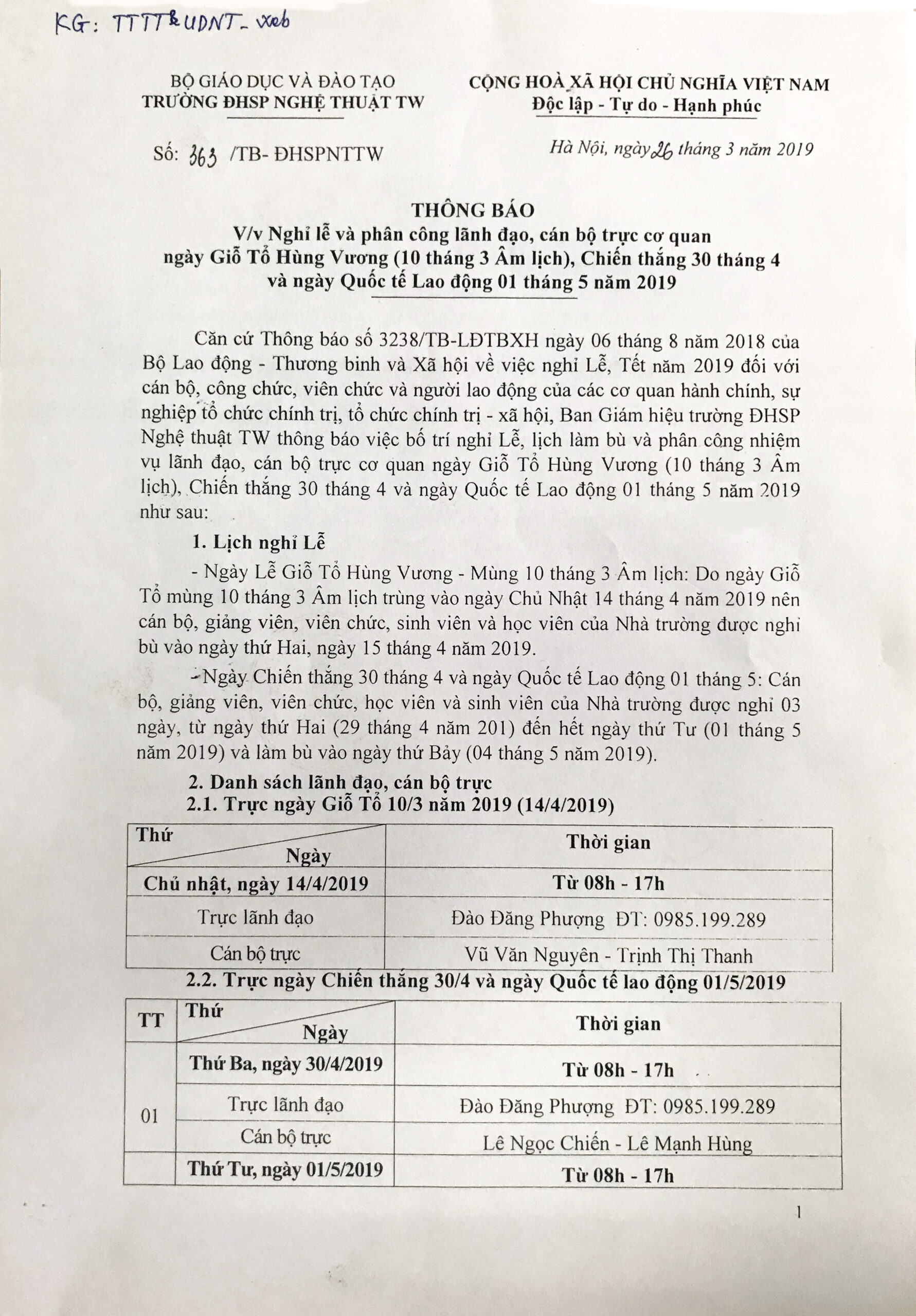 THÔNG BÁO V/v Nghỉ lễ và phân công lãnh đạo, cán bộ trực cơ quan ngày Giỗ Tổ Hùng Vương (10 tháng 3 Âm lịch), Chiến thắng 30 tháng 4 và ngày Quốc tế Lao động 01 tháng 5 năm 2019
