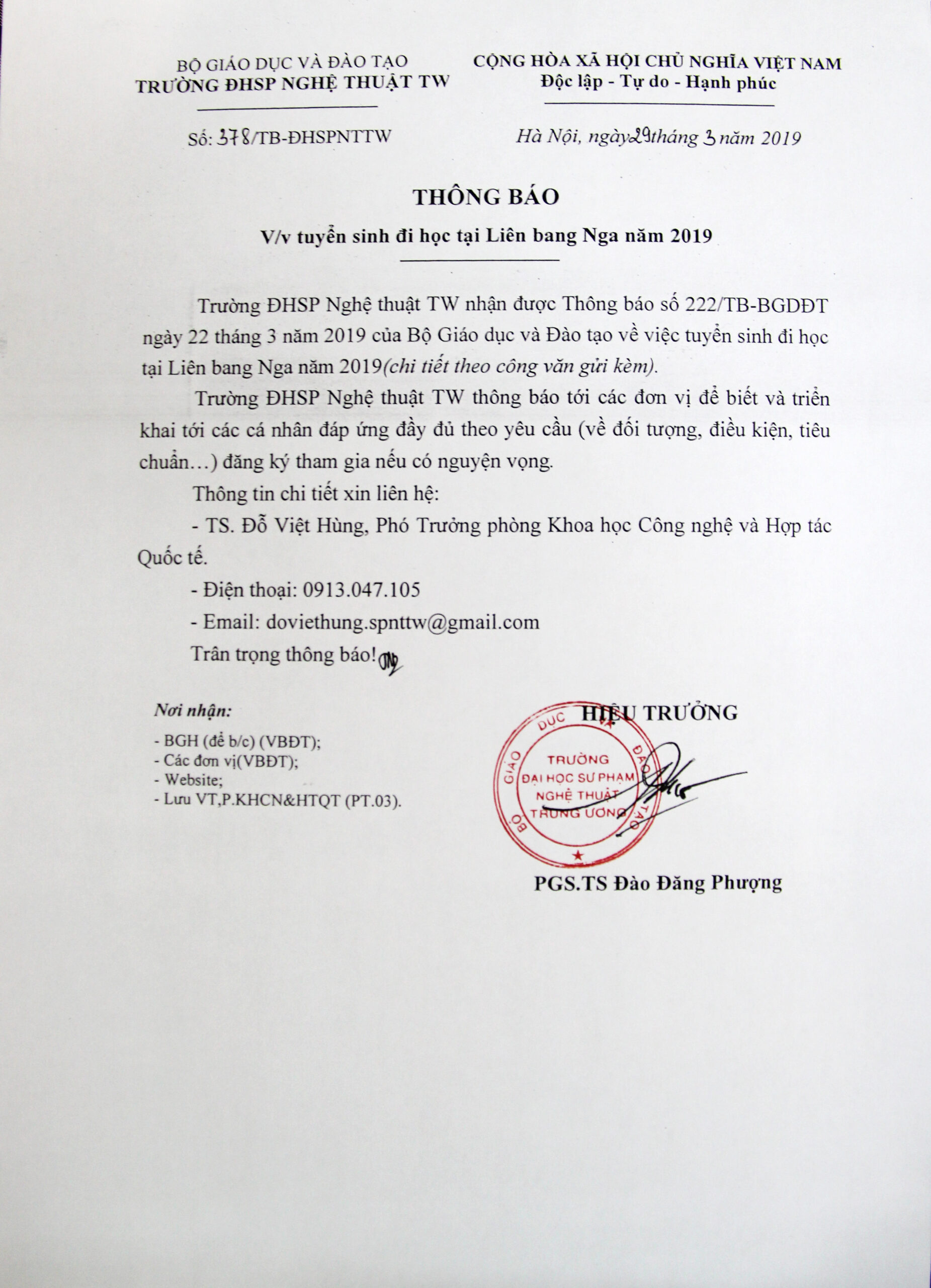 THÔNG BÁO V/v tuyển sinh đi học tại Liên Bang Nga năm 2019