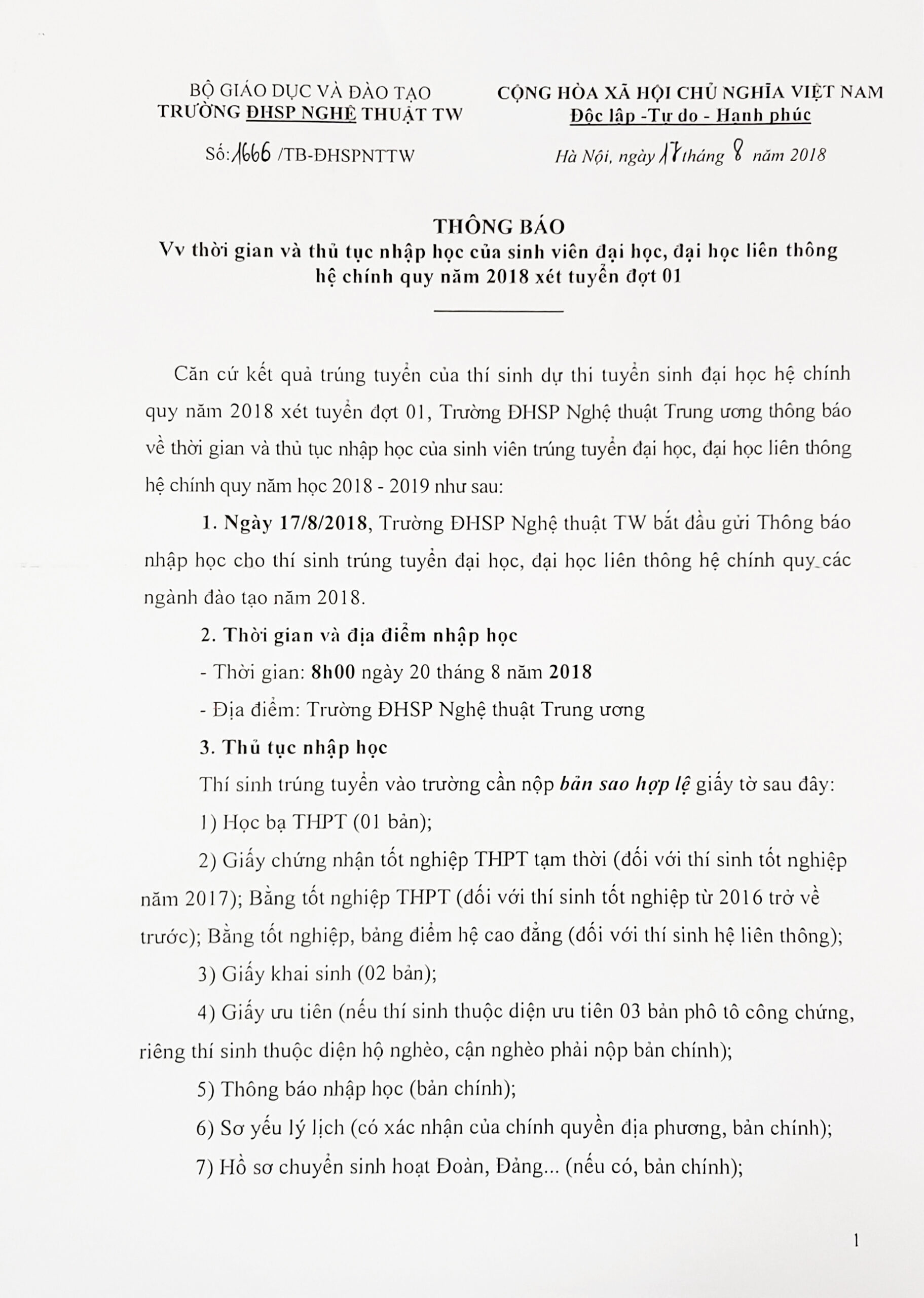 THÔNG BÁO Về việc thời gian và thủ tục nhập học của sinh viên đại học, đại học liên thông hệ chính quy năm 2018 xét tuyển đợt 1