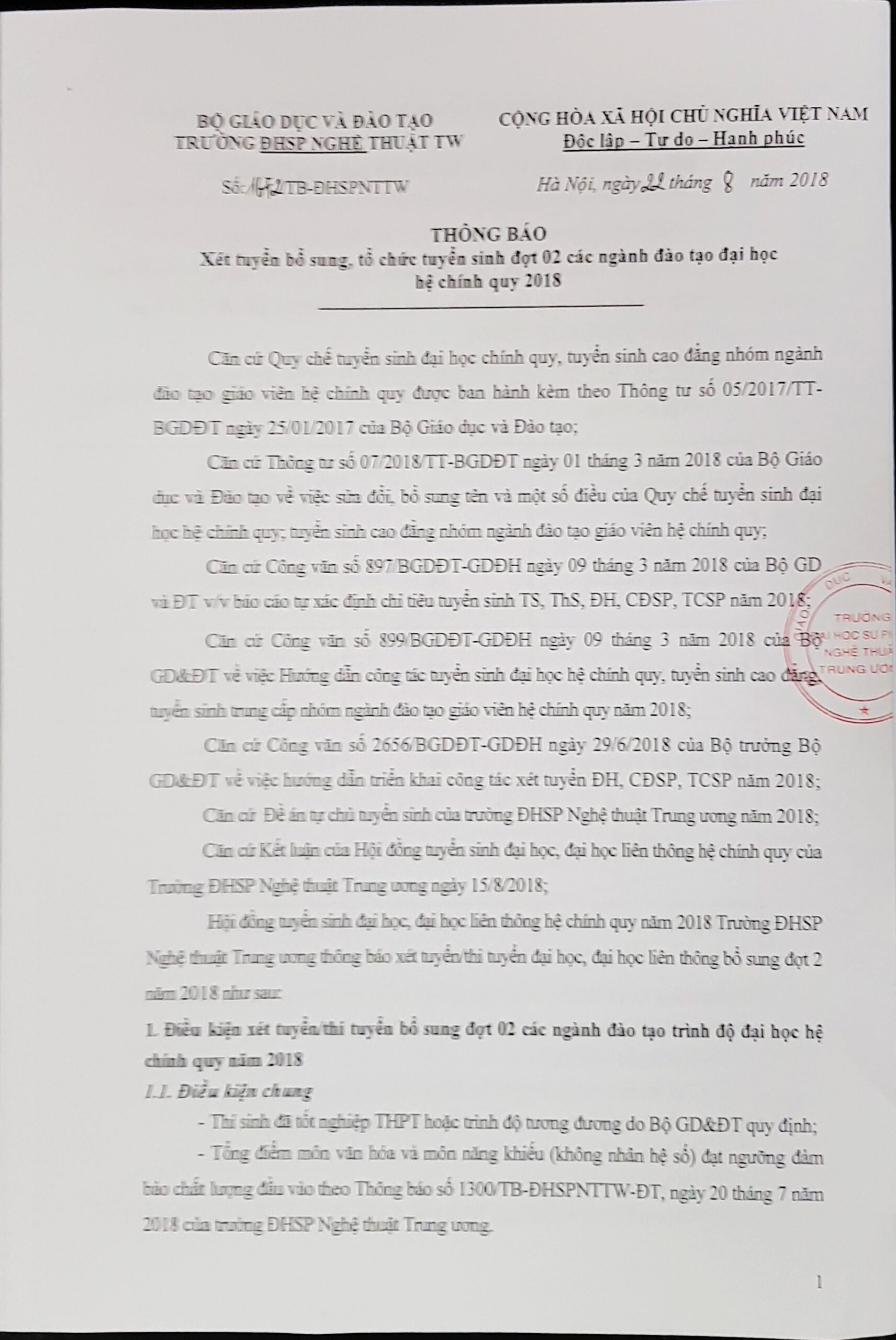 THÔNG BÁO Xét tuyển bổ sung, tổ chức tuyển sinh đợt 02 các ngành đào tạo đại học hệ chính quy 2018