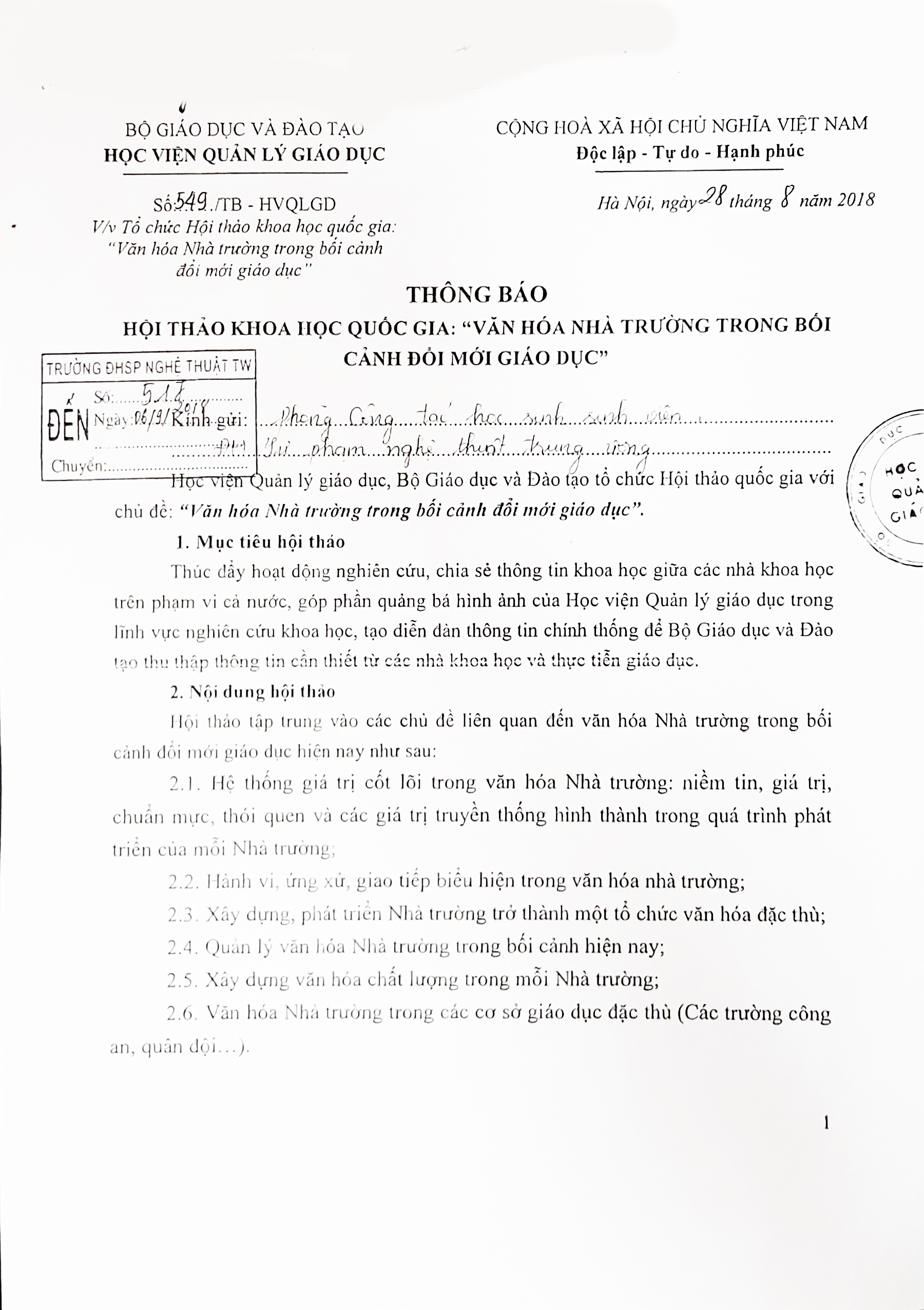 THÔNG BÁO HỘI THẢO KHOA HỌC QUỐC GIA: “VĂN HÓA NHÀ TRƯỜNG TRONG BỐI CẢNH ĐỔI MỚI GIÁO DỤC”