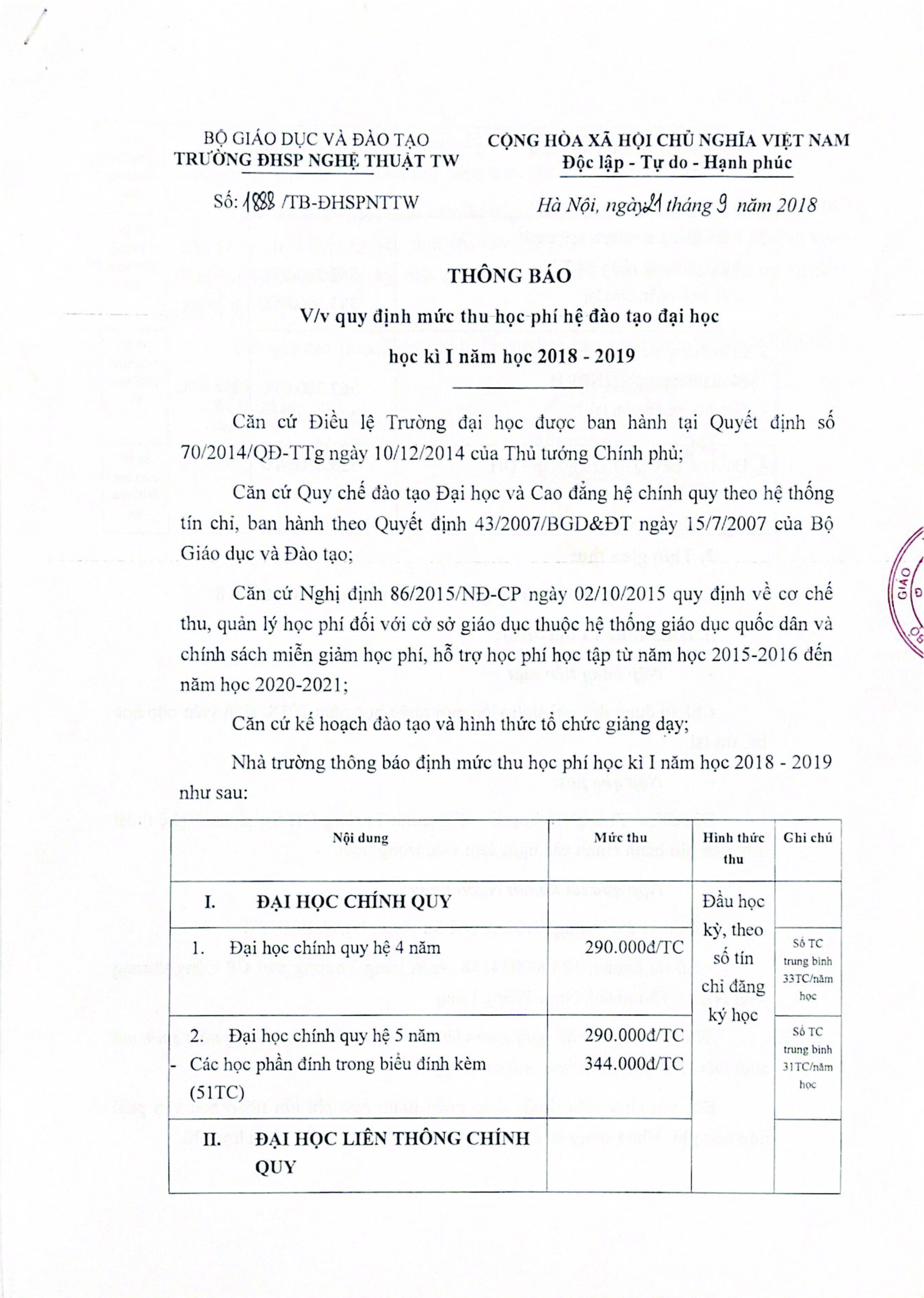 THÔNG BÁO V/v quy định mức thu học phí đệ đào tạo đại học học kỳ I năm học 2018-2019
