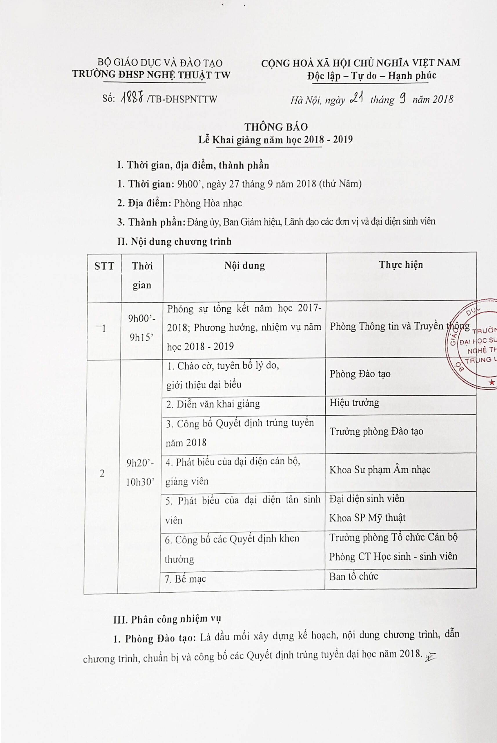 THÔNG BÁO Lễ Khai giảng năm học 2018 – 2019
