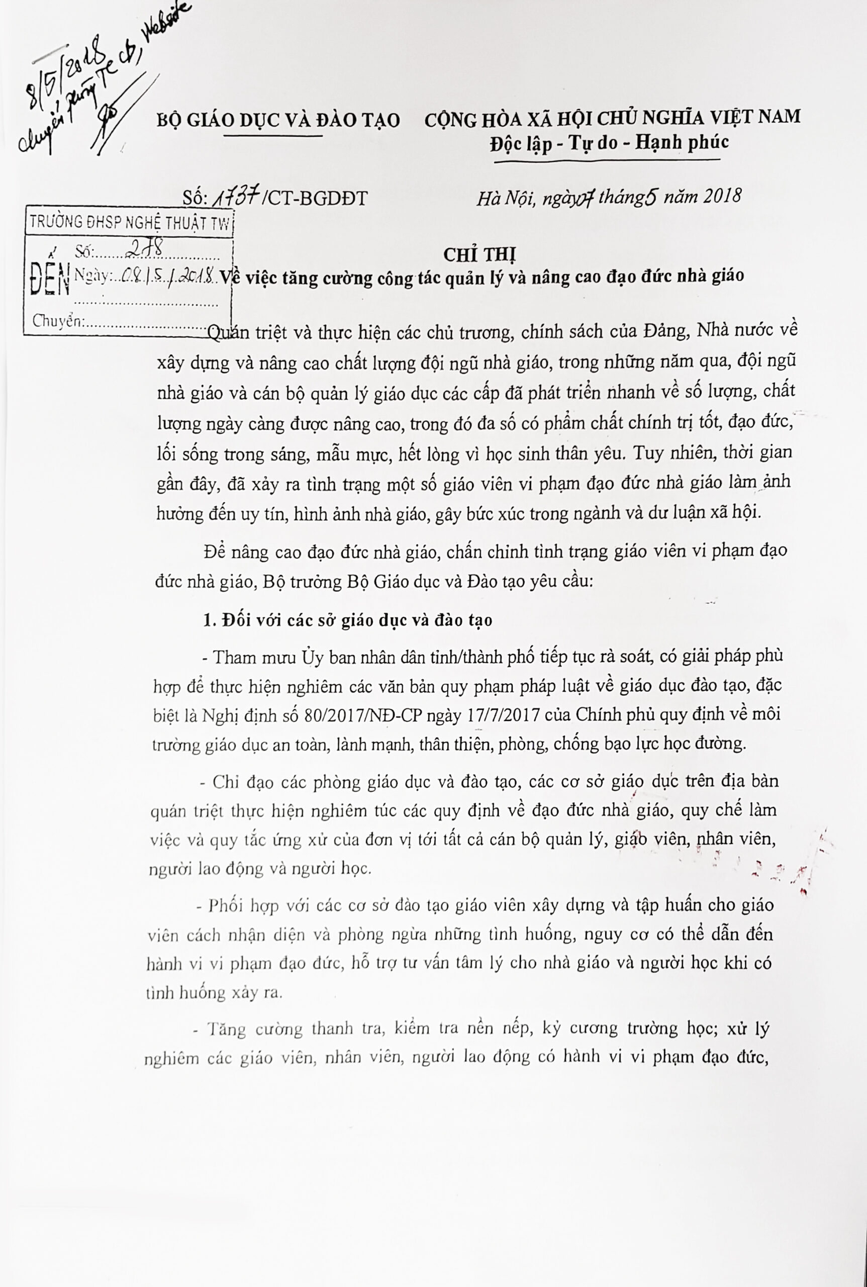 Chỉ thị về việc tăng cường công tác quản lý và nâng cao đạo đức nhà giáo