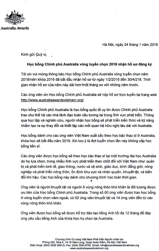 Học bổng chính phủ Australia vòng tuyển chọn 2018 nhận hồ sơ đăng ký