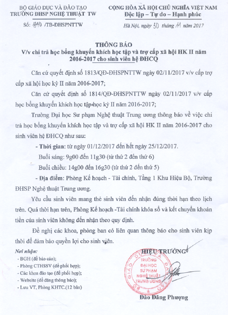 Thông báo chi trả học bổng khuyến khích học tập và trợ cấp xã hội học kỳ II Năm học 2016 – 2017 cho sinh viên hệ ĐHCQ