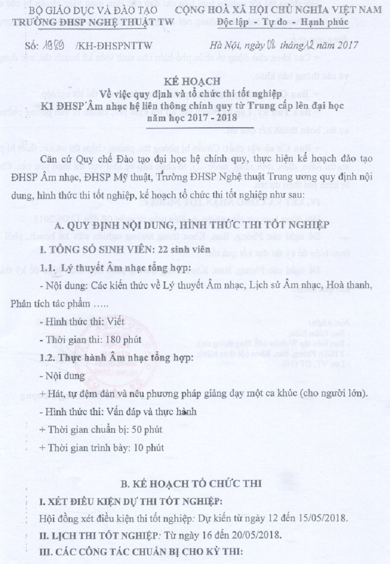 Kế hoạch quy định và tổ chức thi tốt nghiệp K1 ĐHSP Âm nhạc hệ liên thông chính quy từ Trung cấp lên đại học năm học 2017 – 2018