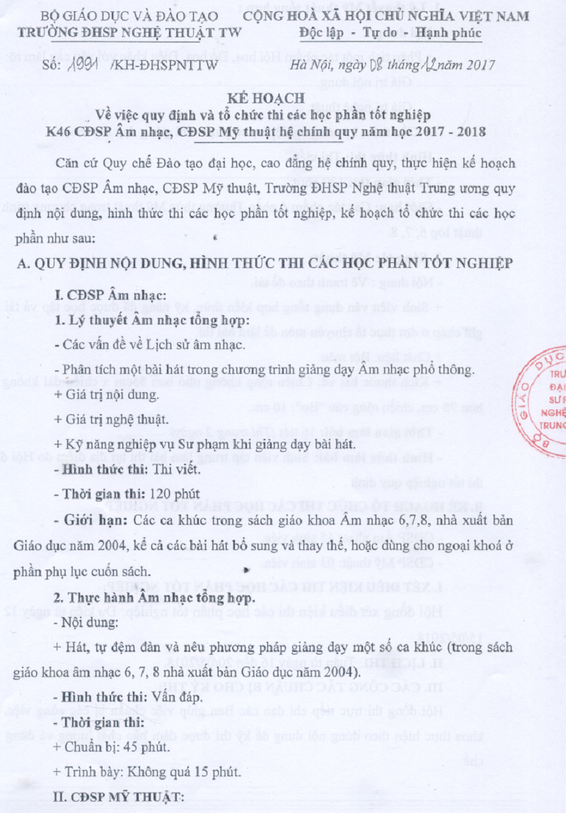 Thông báo quy định và tổ chức thi các học phần tốt nghiệp K46 CĐSP Âm nhạc, Mỹ thuật hệ chính quy năm học 2017 – 2018