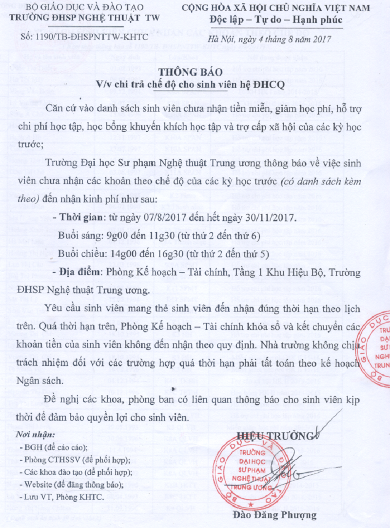 Thông báo chi trả chế độ cho sinh viên hệ ĐHCQ