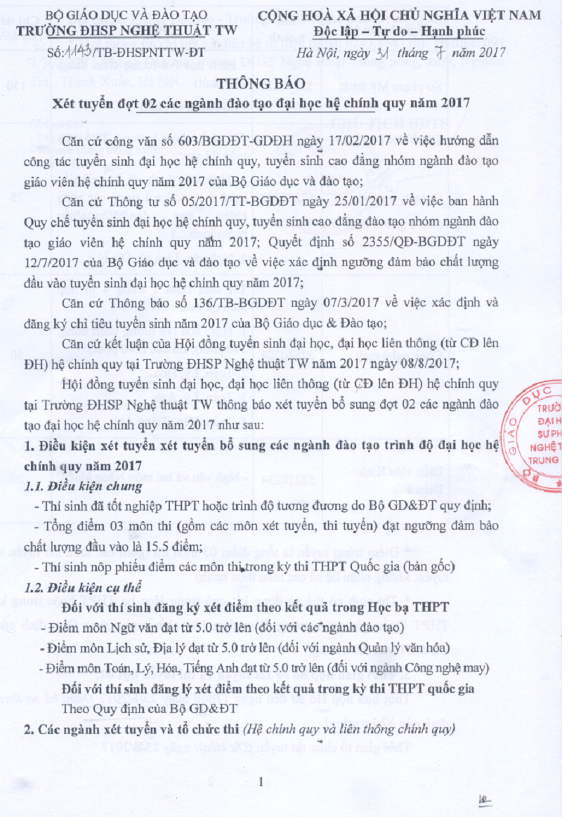 Thông báo xét tuyển đợt 02 các ngành đào tạo đại học hệ chính quy năm 2017