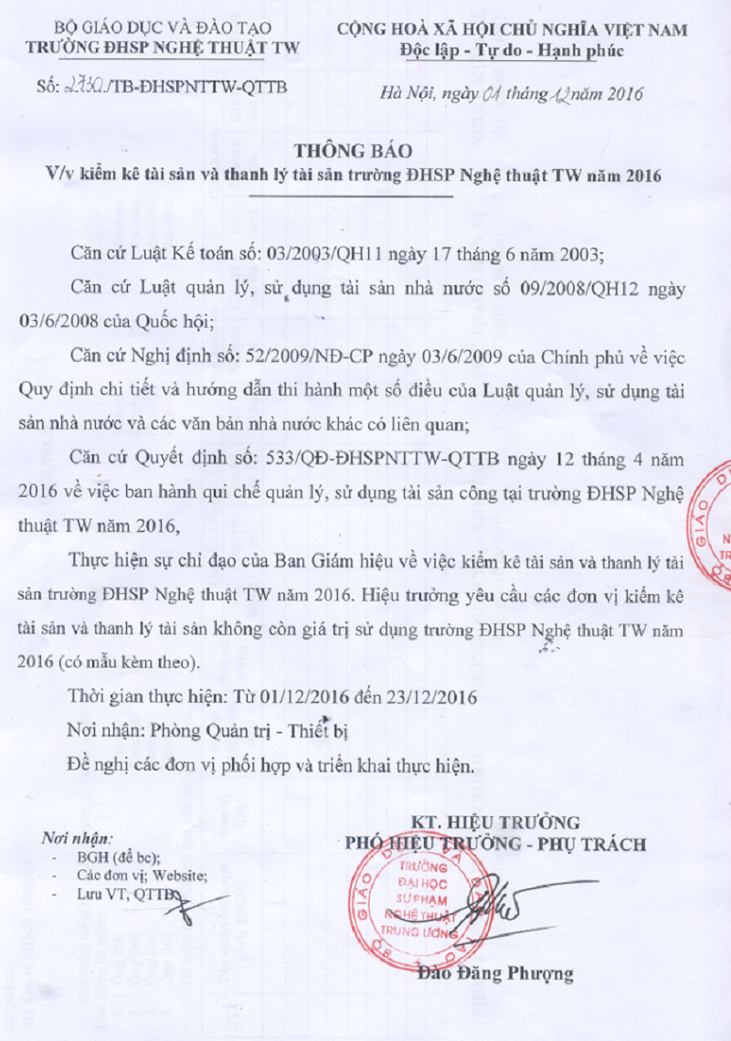 Kiểm kê tài sản và thanh lý tài sản trường ĐHSP Nghệ thuật TW năm 2016