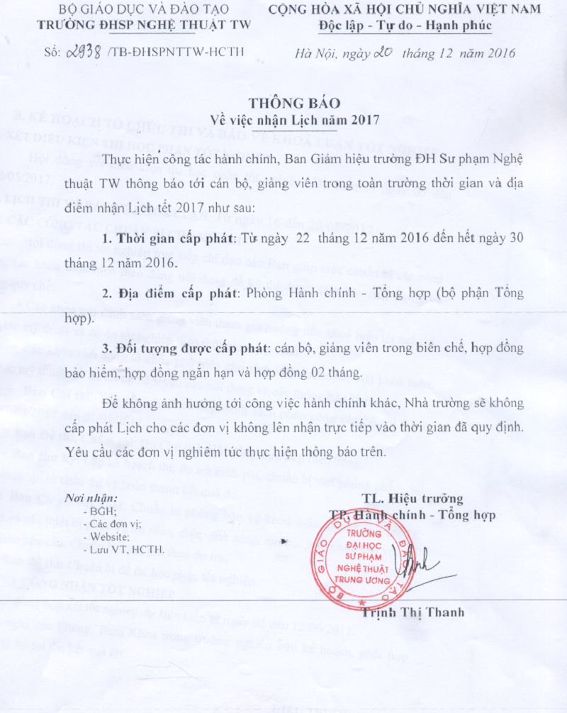 Thông báo về việc nhận Lịch năm 2017