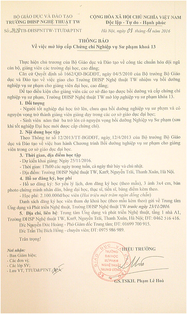 Thông báo mở lớp cấp Chứng chỉ Nghiệp vụ Sư phạm khóa 13