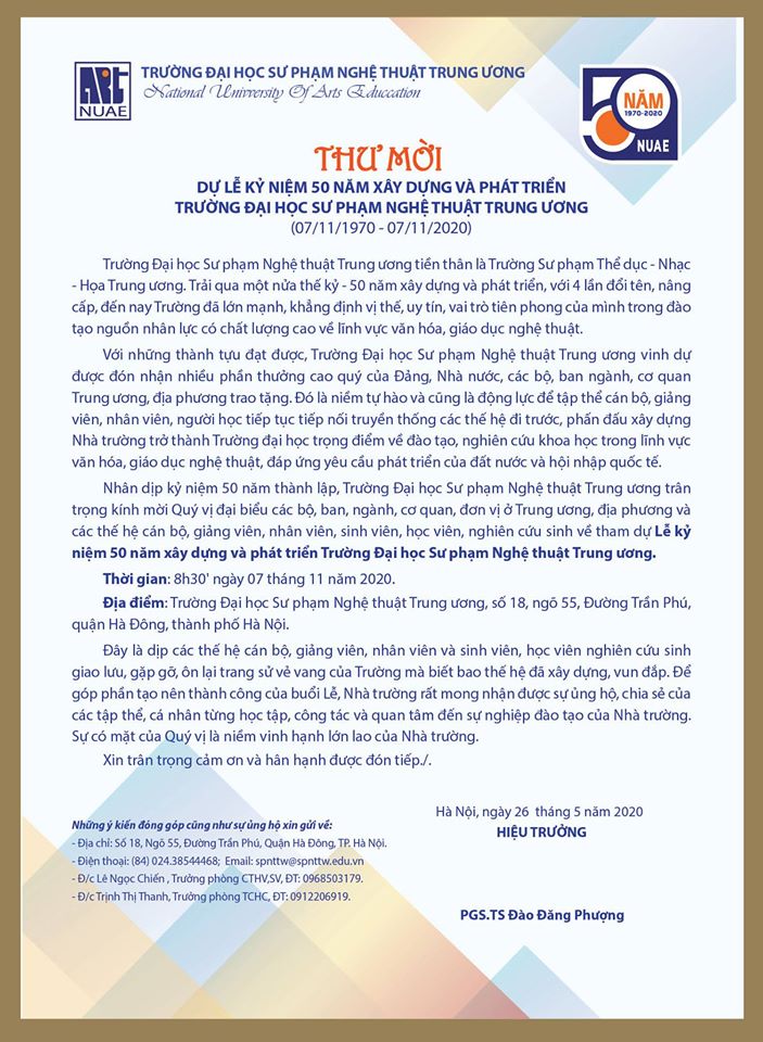 Thư mời dự lễ kỷ niệm 50 năm xây dựng và phát triển trường ĐHSP Nghệ thuật TW