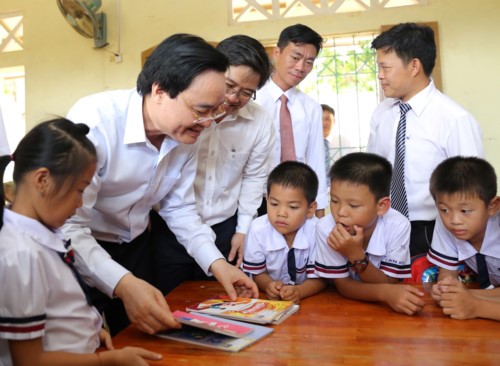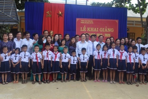 Bộ trưởng Phùng Xuân Nhạ dự khai giảng muộn cùng thầy trò vùng lũ Quảng Bình
