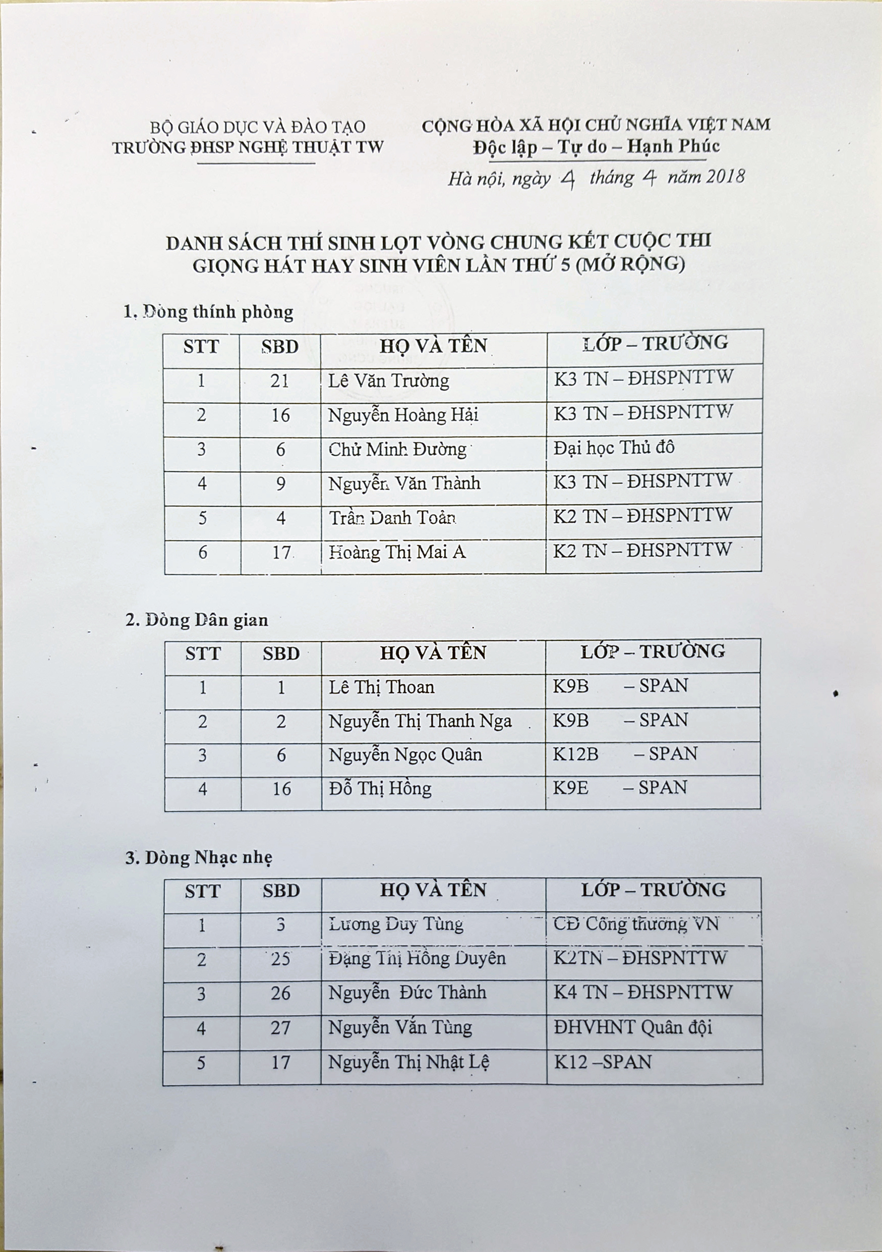 Danh sách thí sinh vòng Chung kết Cuộc thi Giọng hát hay sinh viên – Lần thứ 5 (Mở rộng)