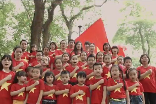 | Các bé thiếu nhi cùng hòa giọng trong MV Quốc ca. Ảnh: Chụp từ clip/ Thanh niên |