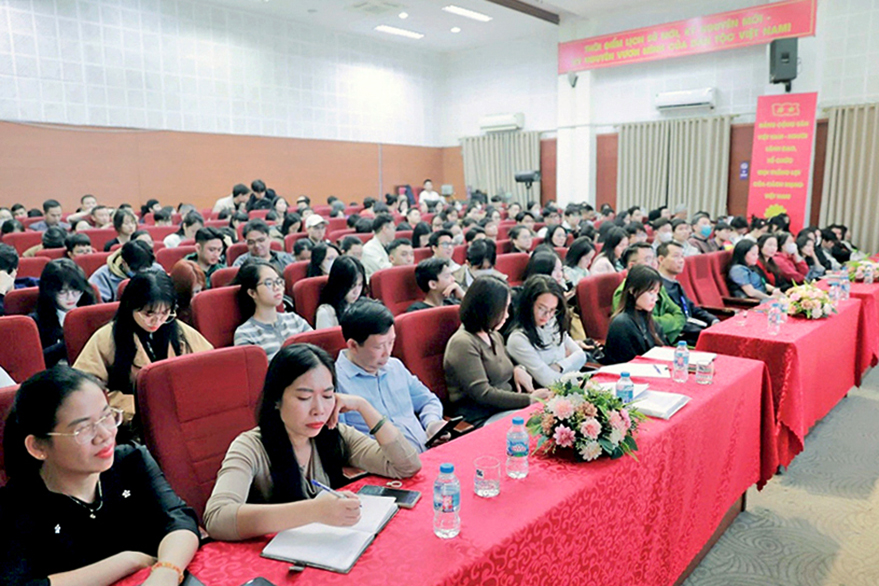 Sinh viên NUAE trực tiếp đặt câu hỏi và trao đổi với lãnh đạo Nhà trường cũng như đại diện Bộ Văn hóa, Thể thao và Du lịch về chi trả kinh phí tham gia Khối xếp hình, xếp chữ nghệ thuật
