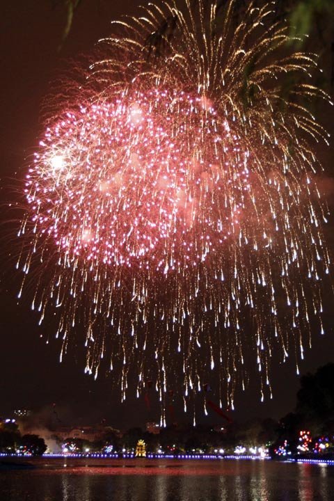 Từ đầu giờ tối, dòng người đổ về chật cứng quanh hồ Gươm háo hức chờ đón những chùm pháo hoa chào đón xuân mới. Hồ Gươm được trang hoàng lỗng lẫy với muôn vàn những chùm đèn, nơi có 2 địa điểm bắn pháo hoa tầm cao của Thủ đô.