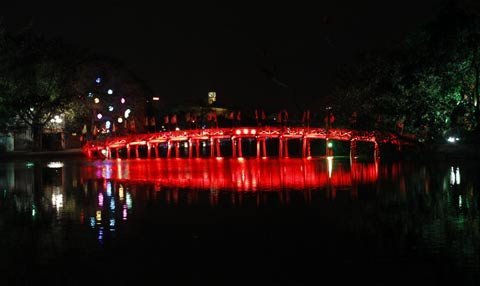 Cầu Thê Húc soi bóng hồ Gươm trong đêm giao thừa