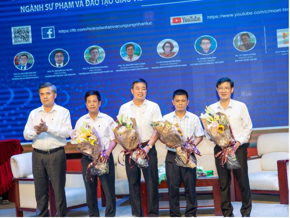 Ông Bùi Văn Linh – Giám đốc Trung tâm Hỗ trợ đào tạo và Cung ứng Nhân lực, Bộ Giáo dục và Đào tạo tặng hoa các vị khách mời của Chương trình
