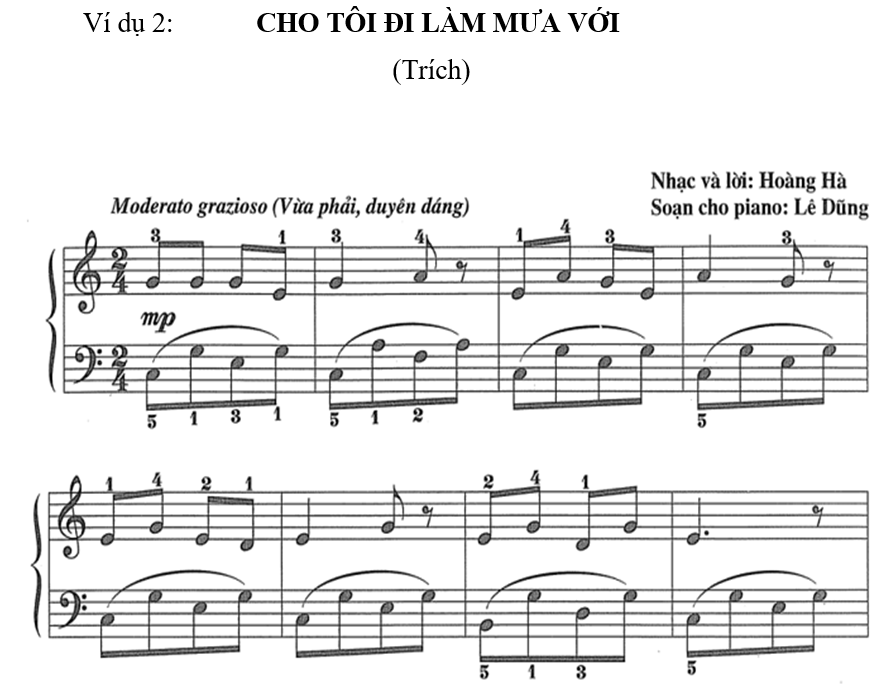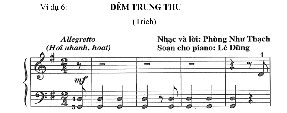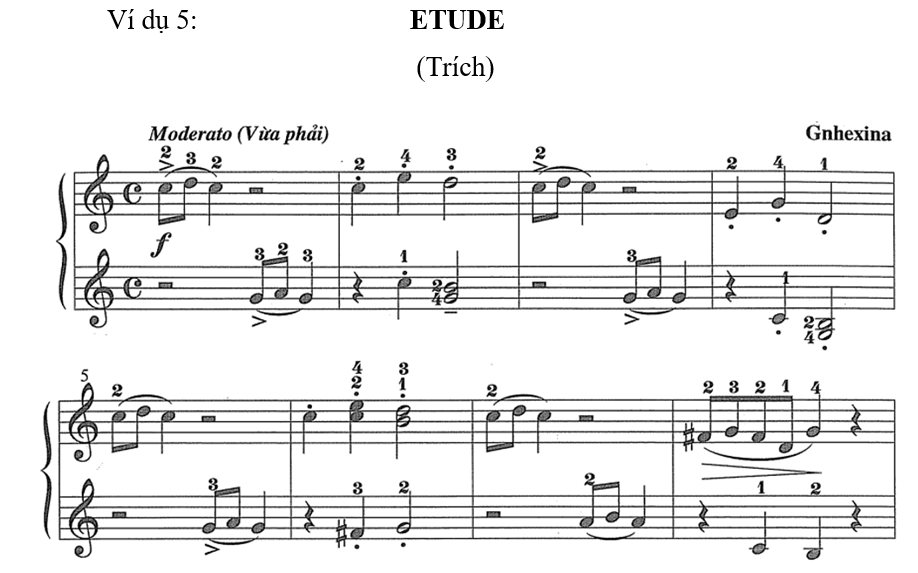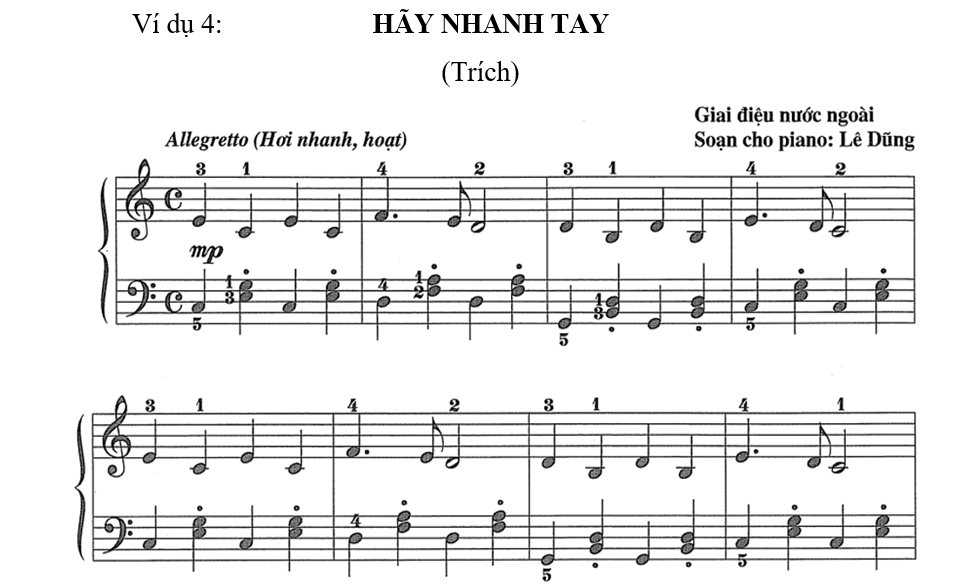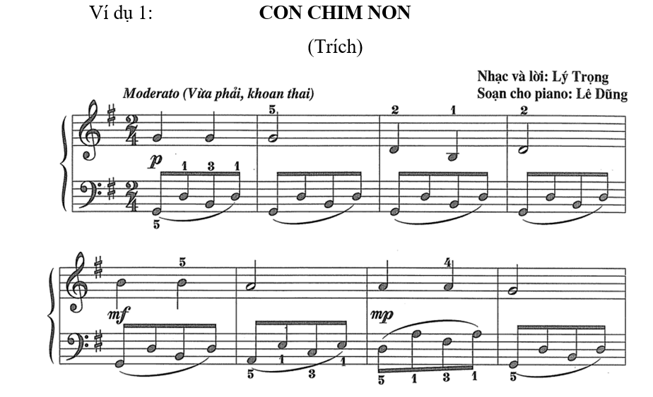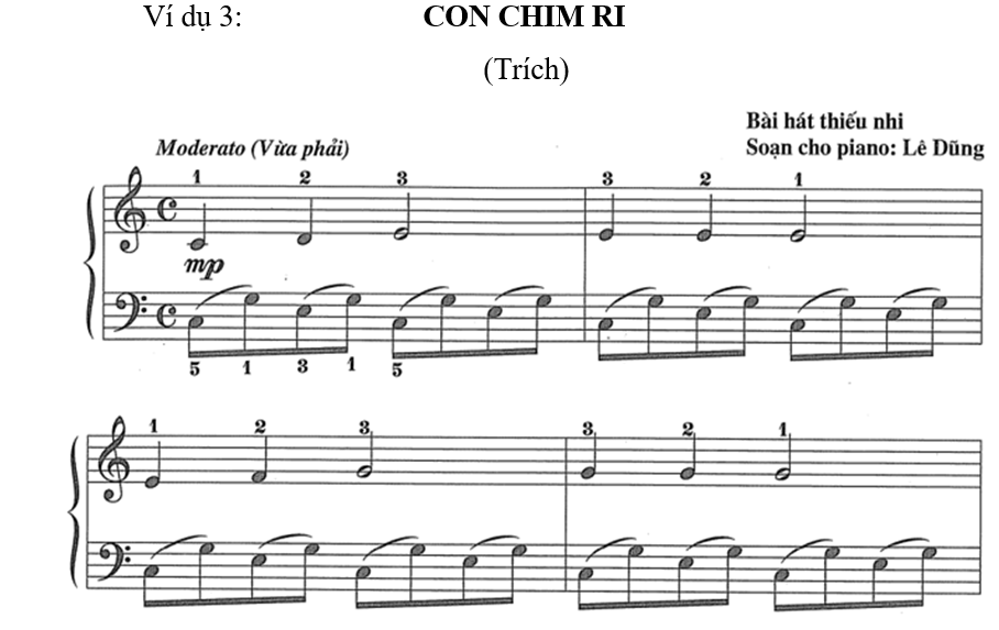 Ở ví dụ trên, bè giai điệu của tay phải được thể hiện bằng kỹ thuật non legato. Đặc biệt, đoạn nhạc sử dụng liên tiếp cùng một cao độ (nốt Mi ở ô nhịp số 2, nốt Sol ở ô nhịp số 4), song HS vẫn phải thực hiện thao tác chuyển ngón từ ngón số 3 sang ngón số 2 và sang ngón số 1. Việc chuyển ngón trong trường hợp này không chỉ mang tính kỹ thuật, mà còn giúp người chơi đảm bảo sự linh hoạt và chính xác trong quá trình biểu diễn. Mỗi nốt cần được phát ra một cách dứt khoát, rõ ràng, giữ gần đủ trường độ nhưng không kéo dài để tạo cảm giác mềm mại, tự nhiên.