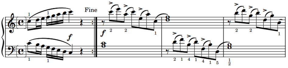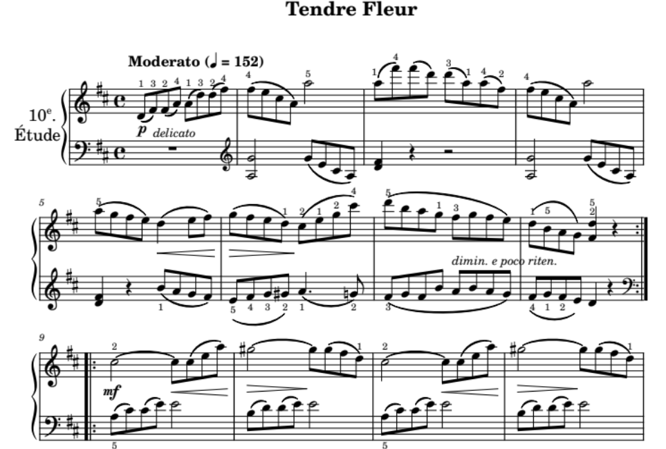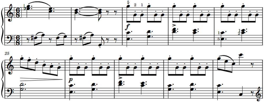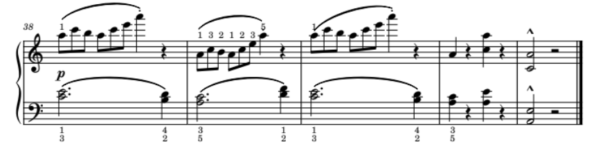 Ở ví dụ trên, GV hướng dẫn HS khi thực hiện các ngón luân phiên trên tay phải và tay trái sử dụng nhiều kỹ thuật non-legato ở cuối dấu luyến, giai điệu di chuyển trên cả 2 tay đòi kỹ thuật ngón tay xử lý âm thanh trên cả 2 tay như nhau. Khi luyên tập HS nên luyện riêng kỹ từng tay, ở cuối mỗi dấu luyến thì phải nhấc cổ tay, rủ bàn tay rồi từ từ nhấc ngón tay, thả lỏng dần cơ thể để âm thanh mềm, ngắt từ từ không bị cụt. Khi ghép 2 tay nên tư duy theo tuyến giai điệu chính luân phiên trên 2 tay giúp dễ hình dung bài và cách xử lý cường độ, sắc thái phù hợp cho bài về sau.