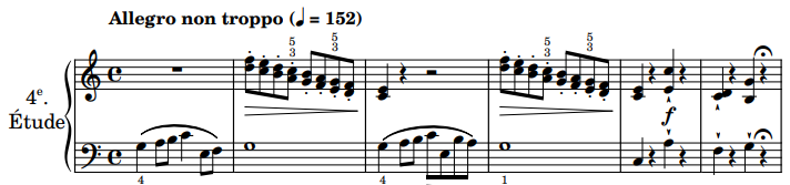 Với ví dụ trên, kỹ thuật staccato với nốt nhảy quãng 8 và đảo ngón trên 1 nốt, liền bậc. GV hướng dẫn HS cần tập chậm, ngón bấm sâu, bám phím, bật nhanh, cổ tay thả lỏng tập chia nhỏ kỹ thuật tập với quãng 8 trước để quen cảm giác khoảng cách quãng cách xa rất dễ trượt, sau đó tập riêng kỹ thuật đảo ngón trên 1 nốt, làm tốt từng phần rồi ghép lại sẽ dễ dàng hơn.