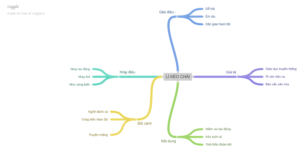 Sơ đồ tư duy giúp học sinh hệ thống hóa các yếu tố âm nhạc một cách trực quan. Khi học bài “Lí kéo chài”, giáo viên hướng dẫn xây dựng sơ đồ với trung tâm là tên bài hát, các nhánh chính bao gồm: đặc điểm giai điệu, nhịp điệu, nội dung ca từ, bối cảnh ra đời và giá trị văn hóa.