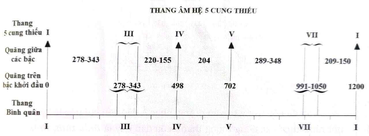 Trong Ả đào một khảo cứu về lịch sử và hệ âm luật, tác giả Bùi Trọng Hiền cho rằng, hệ thống cung điệu của Ca trù gồm: hệ 5 cung thiếu, hệ 5 cung và hệ 4 cung. Hệ 5 cung thiếu, giai điệu chủ yếu được xây dựng trên 3 âm: I, III, V (Do – Mib – Sol), 2 âm còn lại chỉ là phụ trợ. Và đặc điểm giai điệu 3 âm chính là lý do tại sao dạng cung điệu này lại được đặt tên là 5 cung thiếu.