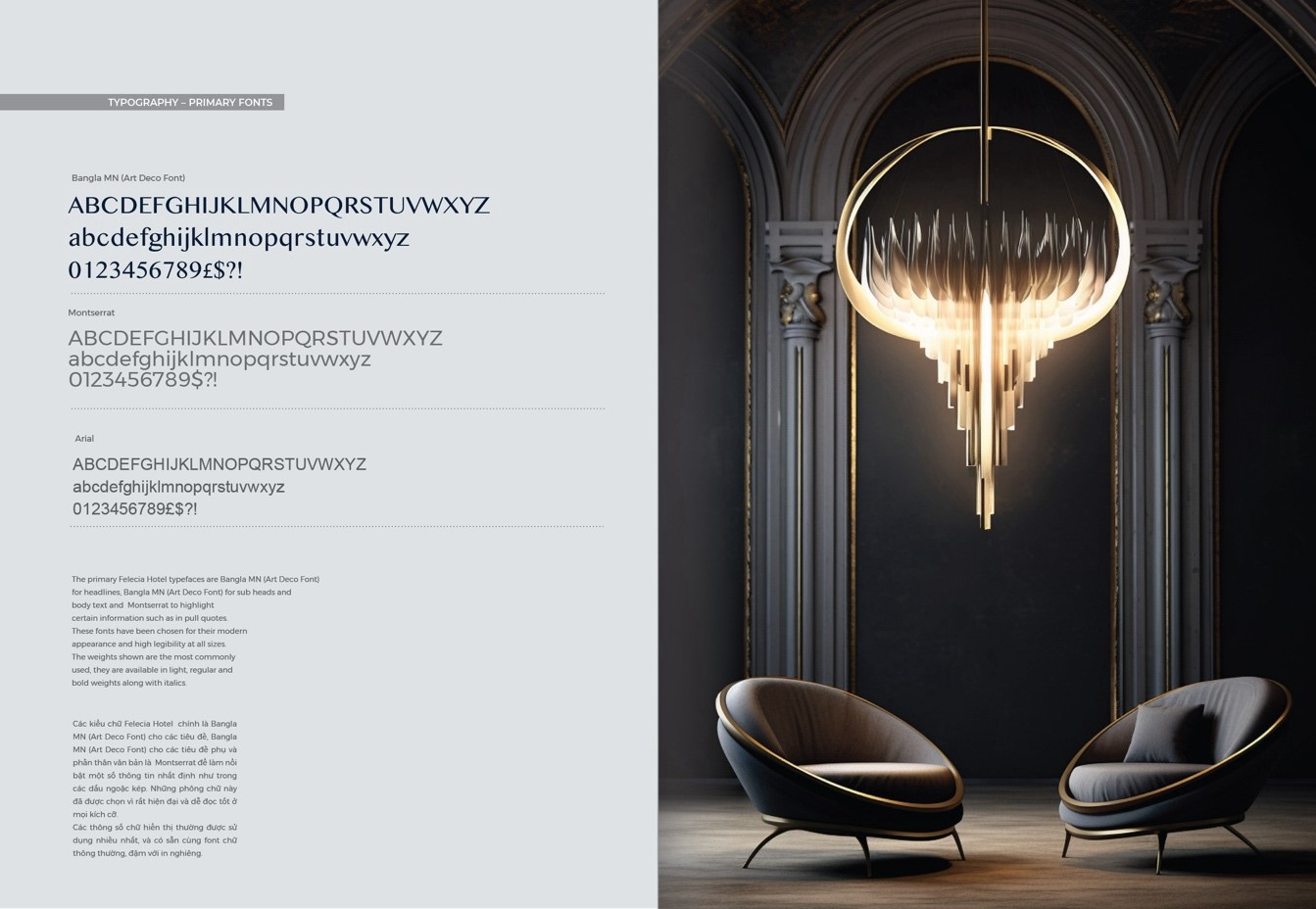 Phong cách Art Deco rất phù hợp với các thương hiệu cao cấp, đặc biệt là trong ngành khách sạn, vì nó mang lại vẻ đẹp thanh lịch nhưng không kém phần mạnh mẽ và hiện đại. Art Deco không chỉ giúp tạo dựng một hình ảnh ấn tượng mà còn mang lại cảm giác về sự tinh tế và sự hoàn hảo trong từng chi tiết, điều này rất quan trọng đối với khách sạn Felecia trong việc xây dựng bộ nhận diện thương hiệu của mình