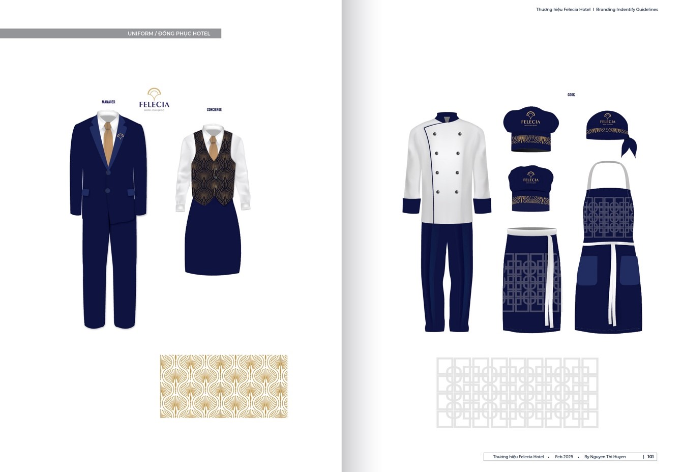 Các họa tiết Chevron và Mosaic, đặc trưng của Art Deco, không chỉ xuất hiện trong logo mà còn được áp dụng rộng rãi trong các thiết kế khác như biển hiệu, brochure, danh thiếp và các nền tảng truyền thông số. Các họa tiết này giúp tạo ra một phong cách thiết kế độc đáo và dễ nhận diện, đồng thời tạo sự đồng bộ trong toàn bộ hệ thống nhận diện thương hiệu của khách sạn Felecia. Sự đồng bộ và linh hoạt trong hệ thống nhận diện: