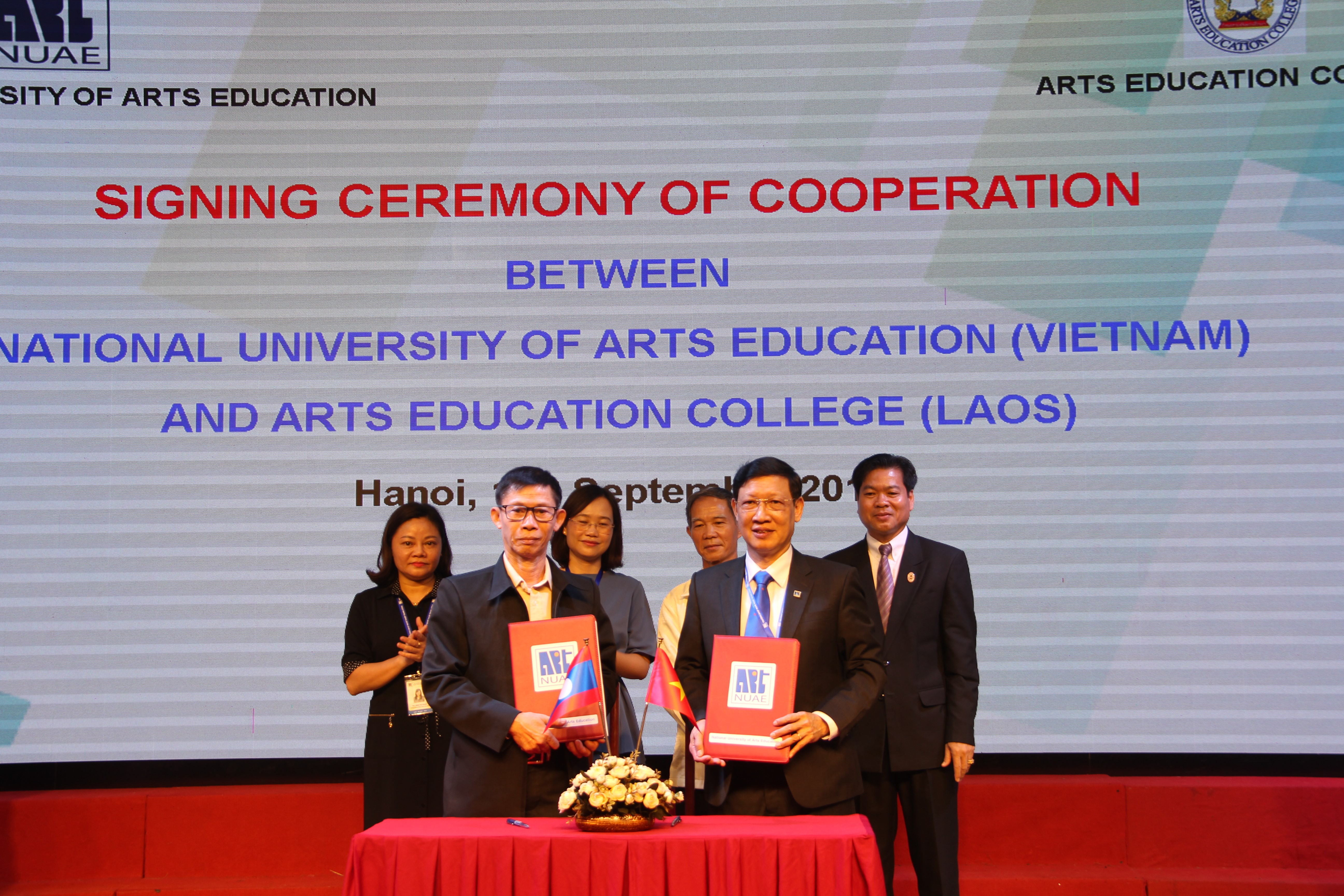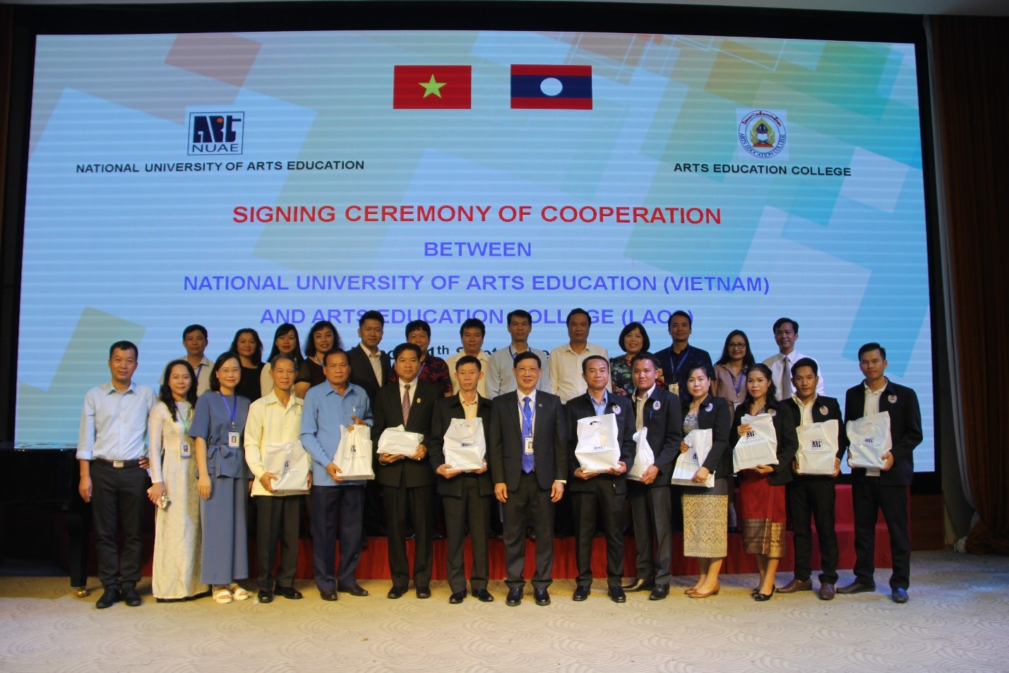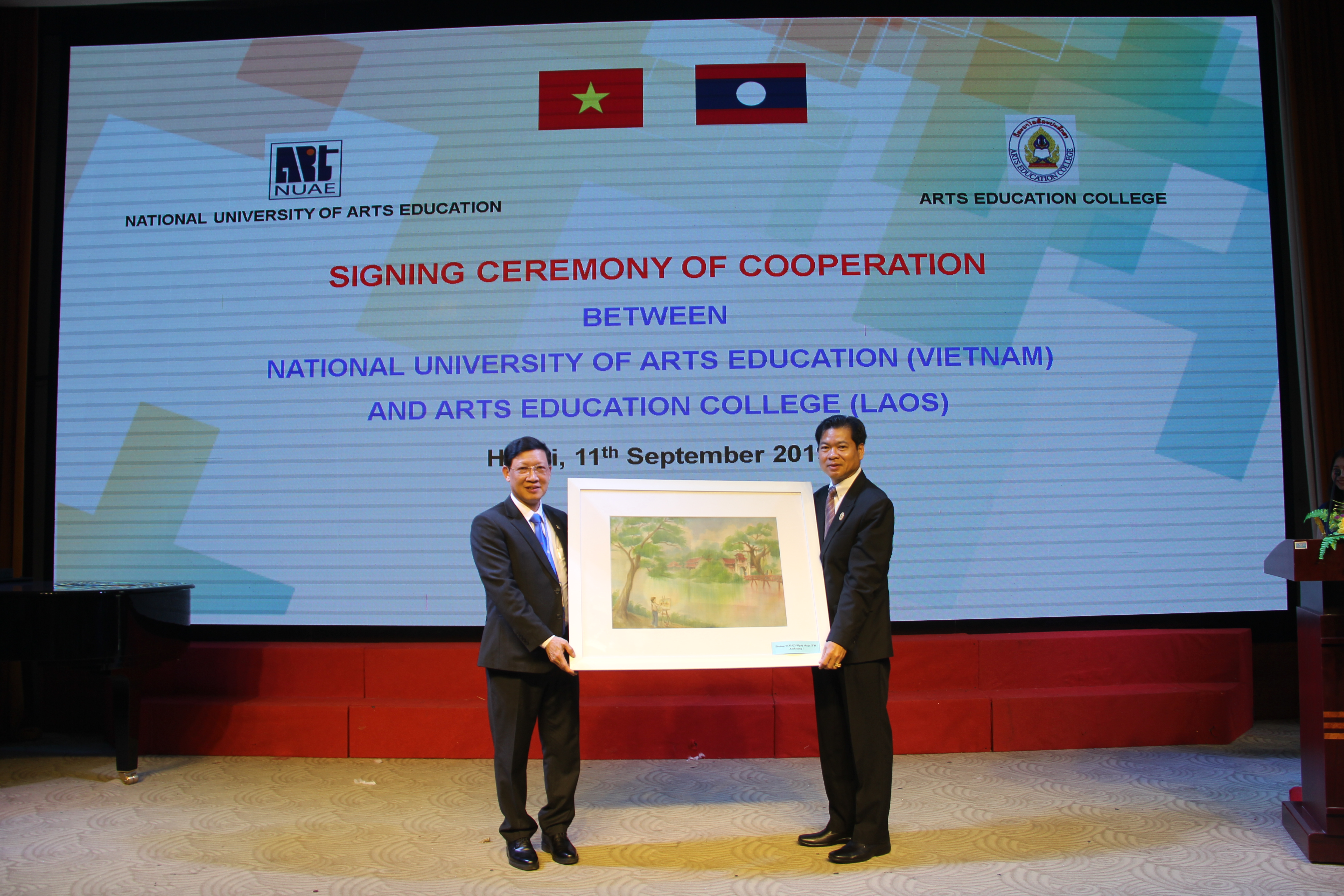 Tại buổi làm việc, Hiệu trưởng Trường ĐHSP Nghệ thuật TW và ông Sisouk Phanhphengdy – Hiệu trưởng Trường CĐSP Nghệ thuật Lào đã ký kết Bản ghi nhớ hợp tác giữa hai trường. Theo đó, mục tiêu ký kết là hai bên nhất trí thiết lập mối quan hệ hợp tác lâu dài trong việc trao đổi thông tin về giáo dục và tài liệu học tập, giảng dạy; Trao đổi hoạt động văn hóa nghệ thuật, nghệ thuật biểu diễn, âm nhạc và mỹ thuật; Đồng tổ chức hội nghị, hội thảo; Trao đổi giảng viên, sinh viên, nhà nghiên cứu và cán bộ quản lý, tham gia giảng dạy ngắn hạn, học tập và nghiên cứu (1 – 2 lần/năm); Hỗ trợ đào tạo giảng viên ở trình độ đại học, thạc sĩ và trình độ tiến sĩ ở các ngành học tương đồng và được sự đồng ý của hai bên.