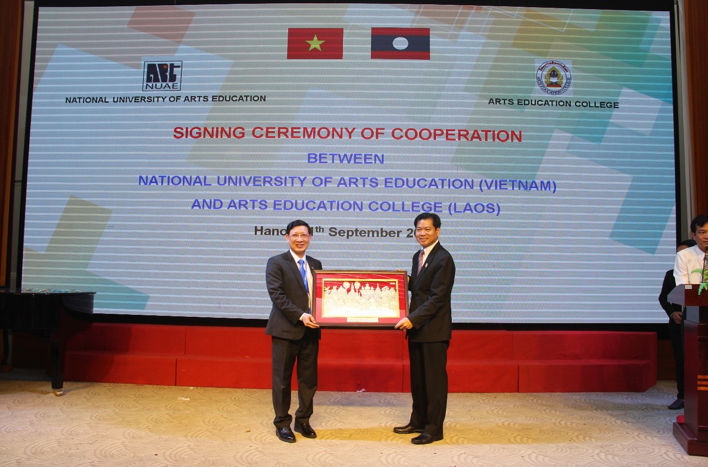 PGS.TS. Đào Đăng Phượng và ông Sisouk Phanhphengdy – Quyền Hiệu trưởng Trường CĐSP Nghệ thuật Lào trao văn bản hợp tác