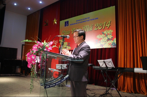 Thay mặt Đảng ủy, Ban Giám hiệu, PGS.TSKH. Phạm Lê Hòa, Bí thư Đảng ủy, Hiệu trưởng đã bày tỏ sự vui mừng trước sự lớn mạnh của trường trong thời gian qua. Dưới sự chỉ đạo đúng đắn của Ban giám hiệu cùng tinh thần đoàn kết nỗ lực của tập thể cán bộ và giảng viên, Nhà trường đã hoàn thành tốt mọi nhiệm vụ được cấp trên giao. Không chỉ tham gia tích cực nhiều hoạt động chung được xã hội ghi nhận mà hoạt động dạy và học của Trường cũng được đánh giá cao qua các thành tích nổi bật. Về công tác Đảng: Ba năm liền Trường được Đảng bộ khối các trường Đại học, Cao đẳng công nhận là tập thể trong sạch vững mạnh tiêu biểu. Trong hoạt động đào tạo, Trường không ngừng mở rộng quy mô và nâng cao chất lượng đào tạo các ngành học. Đặc biệt trong năm 2013 trường đã mở thêm các ngành đào tạo đại học và sau đại học như: đại học Thanh nhạc, cao học Quản lý văn hóa, tiếp tục nâng cao chất lượng, thu hút học viên cao học đối với chuyên ngành Lý luận và Phương pháp dạy học âm nhạc…. Những thành quả trên vừa là niềm tự hào đồng thời cũng là động lực để tập thể cán bộ, giảng viên và sinh viên nhà trường tiếp tục cố gắng nhiều hơn nữa trong năm 2014 này.