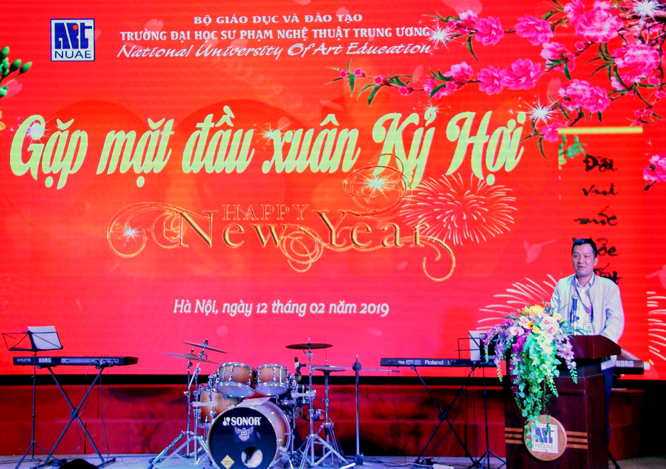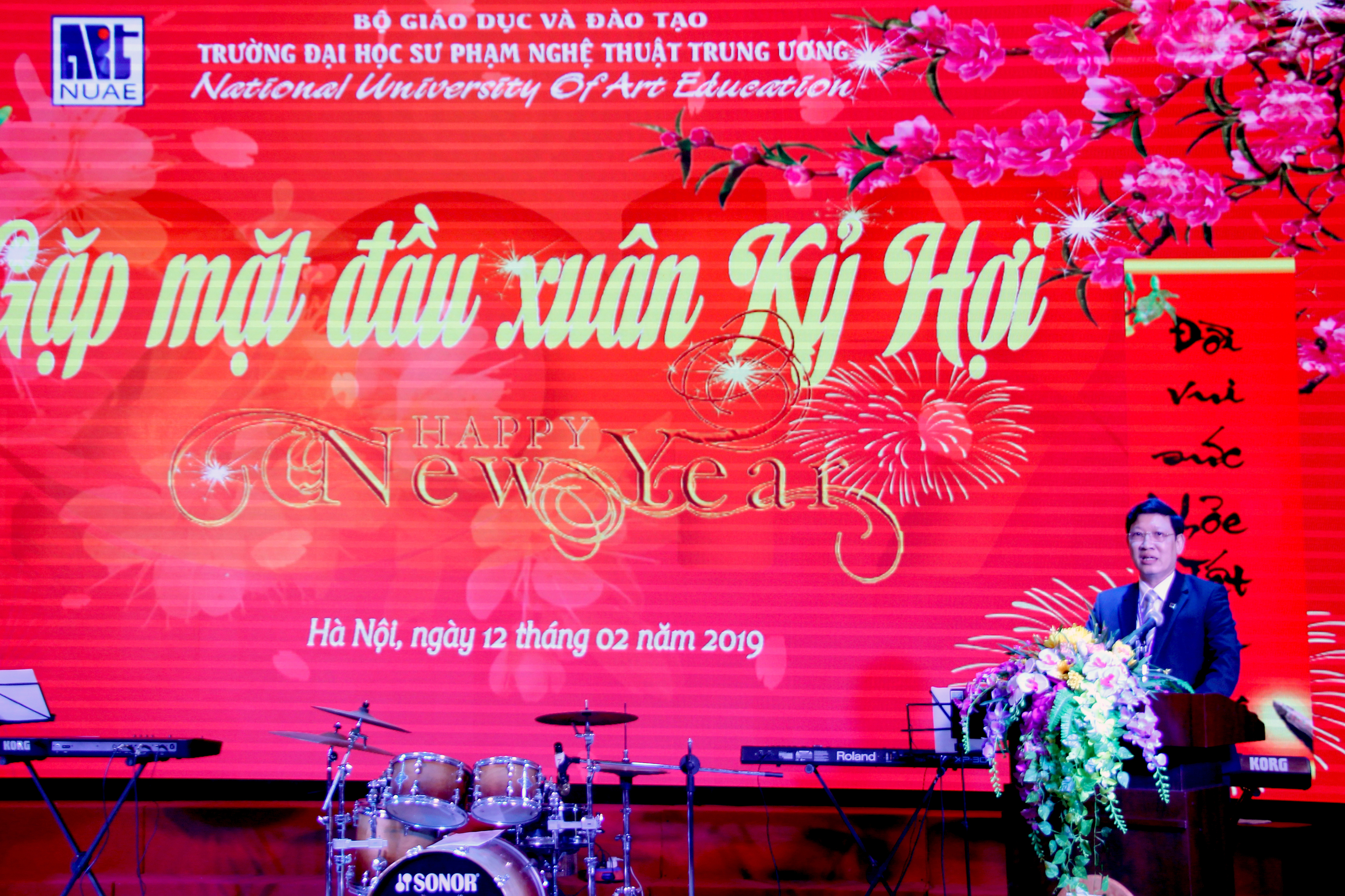 Sau chương trình nghệ thuật do giảng viên, sinh viên Nhà trường biểu diễn, PGS.TS. Đào Đăng Phượng – Bí thư Đảng ủy, Hiệu trưởng Nhà trường phát biểu và gửi những lời chúc tốt đẹp nhất đến toàn thể cán bộ, giảng viên, học viên, sinh viên nhân dịp năm mới. Đồng thời, PGS.TS. Đào Đăng Phượng cũng bày tỏ hy vọng trong năm 2019, tập thể cán bộ, giảng viên Nhà trường sẽ tiếp tục đoàn kết, phấn đấu và quyết tâm hơn nữa để hoàn thành xuất sắc những kế hoạch đã đề ra, góp phần vào sự phát triển chung của Trường Đại học Sư phạm Nghệ thuật Trung ương.